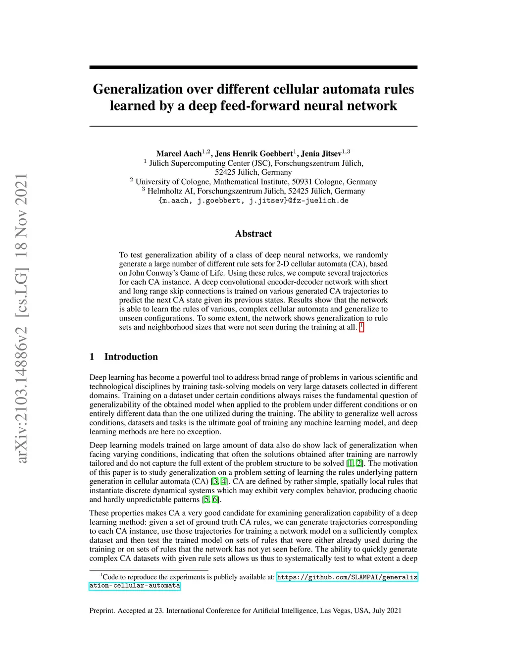 To test generalization ability of a class of deep neural networks, we randomly generate a large number of different rule sets for 2-D cellular automata (CA), based on John Conway's Game of Life. Using these rules, we compute several trajectories for each CA instance. A deep convolutional encoder-decoder network with short and long range skip connections is trained on various generated CA trajectories to predict the next CA state given its previous states. Results show that the network is able to learn the rules of various, complex cellular automata and generalize to unseen configurations. To some extent, the network shows generalization to rule sets and neighborhood sizes that were not seen during the training at all. Code to reproduce the experiments is publicly available at: https://github.com/SLAMPAI/generalization-cellular-automata