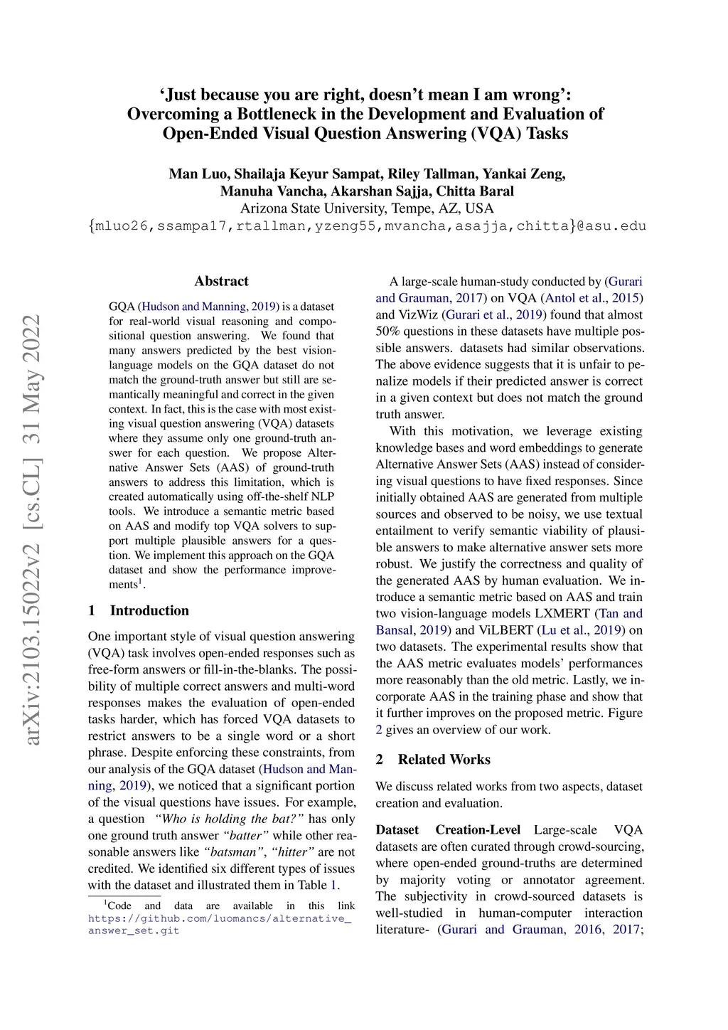 GQA~\citep{hudson2019gqa} is a dataset for real-world visual reasoning and compositional question answering. We found that many answers predicted by the best vision-language models on the GQA dataset do not match the ground-truth answer but still are semantically meaningful and correct in the given context. In fact, this is the case with most existing visual question answering (VQA) datasets where they assume only one ground-truth answer for each question. We propose Alternative Answer Sets (AAS) of ground-truth answers to address this limitation, which is created automatically using off-the-shelf NLP tools. We introduce a semantic metric based on AAS and modify top VQA solvers to support multiple plausible answers for a question. We implement this approach on the GQA dataset and show the performance improvements. Code and data are available in this link \url{https://github.com/luomancs/alternative_answer_set.git}.