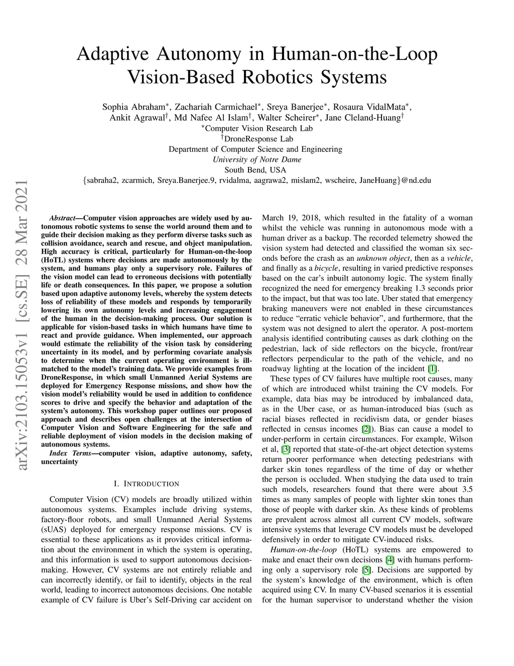 Computer vision approaches are widely used by autonomous robotic systems to sense the world around them and to guide their decision making as they perform diverse tasks such as collision avoidance, search and rescue, and object manipulation. High accuracy is critical, particularly for Human-on-the-loop (HoTL) systems where decisions are made autonomously by the system, and humans play only a supervisory role. Failures of the vision model can lead to erroneous decisions with potentially life or death consequences. In this paper, we propose a solution based upon adaptive autonomy levels, whereby the system detects loss of reliability of these models and responds by temporarily lowering its own autonomy levels and increasing engagement of the human in the decision-making process. Our solution is applicable for vision-based tasks in which humans have time to react and provide guidance. When implemented, our approach would estimate the reliability of the vision task by considering uncertainty in its model, and by performing covariate analysis to determine when the current operating environment is ill-matched to the model's training data. We provide examples from DroneResponse, in which small Unmanned Aerial Systems are deployed for Emergency Response missions, and show how the vision model's reliability would be used in addition to confidence scores to drive and specify the behavior and adaptation of the system's autonomy. This workshop paper outlines our proposed approach and describes open challenges at the intersection of Computer Vision and Software Engineering for the safe and reliable deployment of vision models in the decision making of autonomous systems.