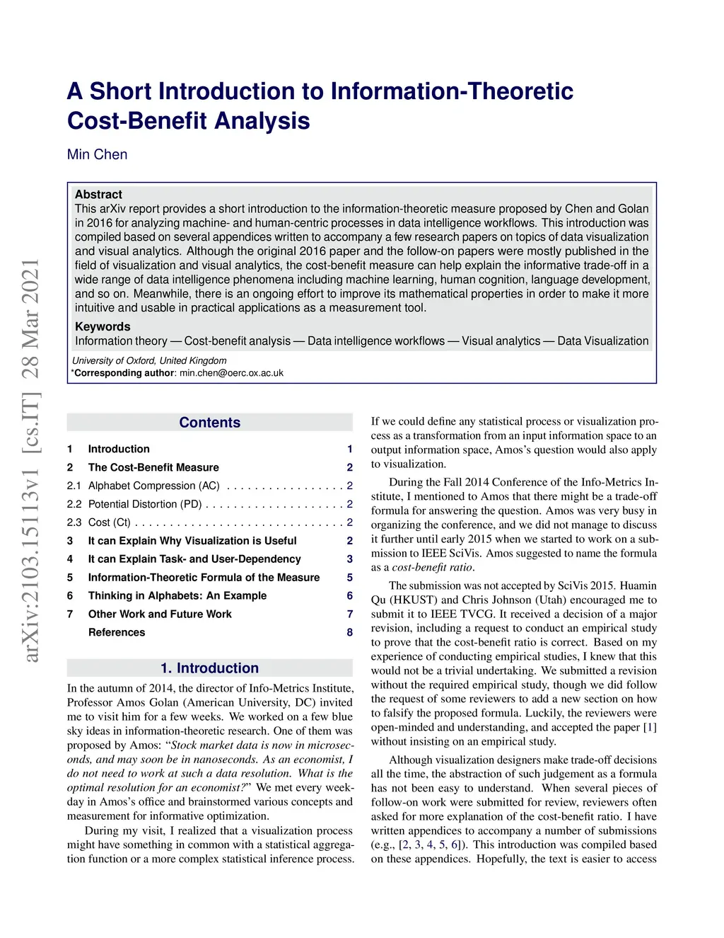 This arXiv report provides a short introduction to the information-theoretic measure proposed by Chen and Golan in 2016 for analyzing machine- and human-centric processes in data intelligence workflows. This introduction was compiled based on several appendices written to accompany a few research papers on topics of data visualization and visual analytics. Although the original 2016 paper and the follow-on papers were mostly published in the field of visualization and visual analytics, the cost-benefit measure can help explain the informative trade-off in a wide range of data intelligence phenomena including machine learning, human cognition, language development, and so on. Meanwhile, there is an ongoing effort to improve its mathematical properties in order to make it more intuitive and usable in practical applications as a measurement tool.