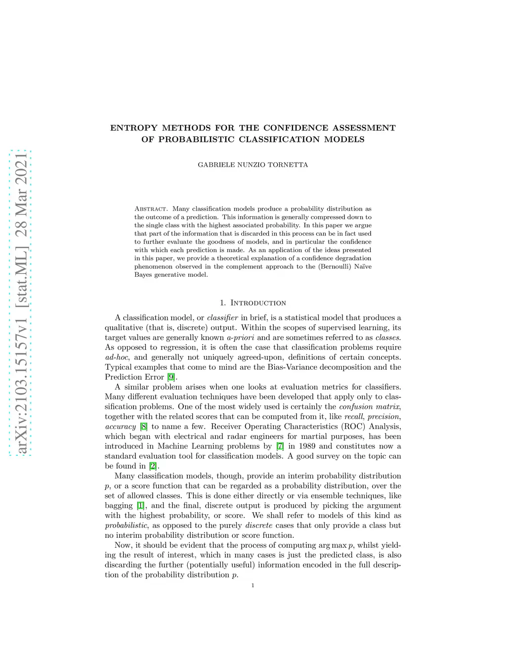 Many classification models produce a probability distribution as the outcome of a prediction. This information is generally compressed down to the single class with the highest associated probability. In this paper, we argue that part of the information that is discarded in this process can be in fact used to further evaluate the goodness of models, and in particular the confidence with which each prediction is made. As an application of the ideas presented in this paper, we provide a theoretical explanation of a confidence degradation phenomenon observed in the complement approach to the (Bernoulli) Naive Bayes generative model.