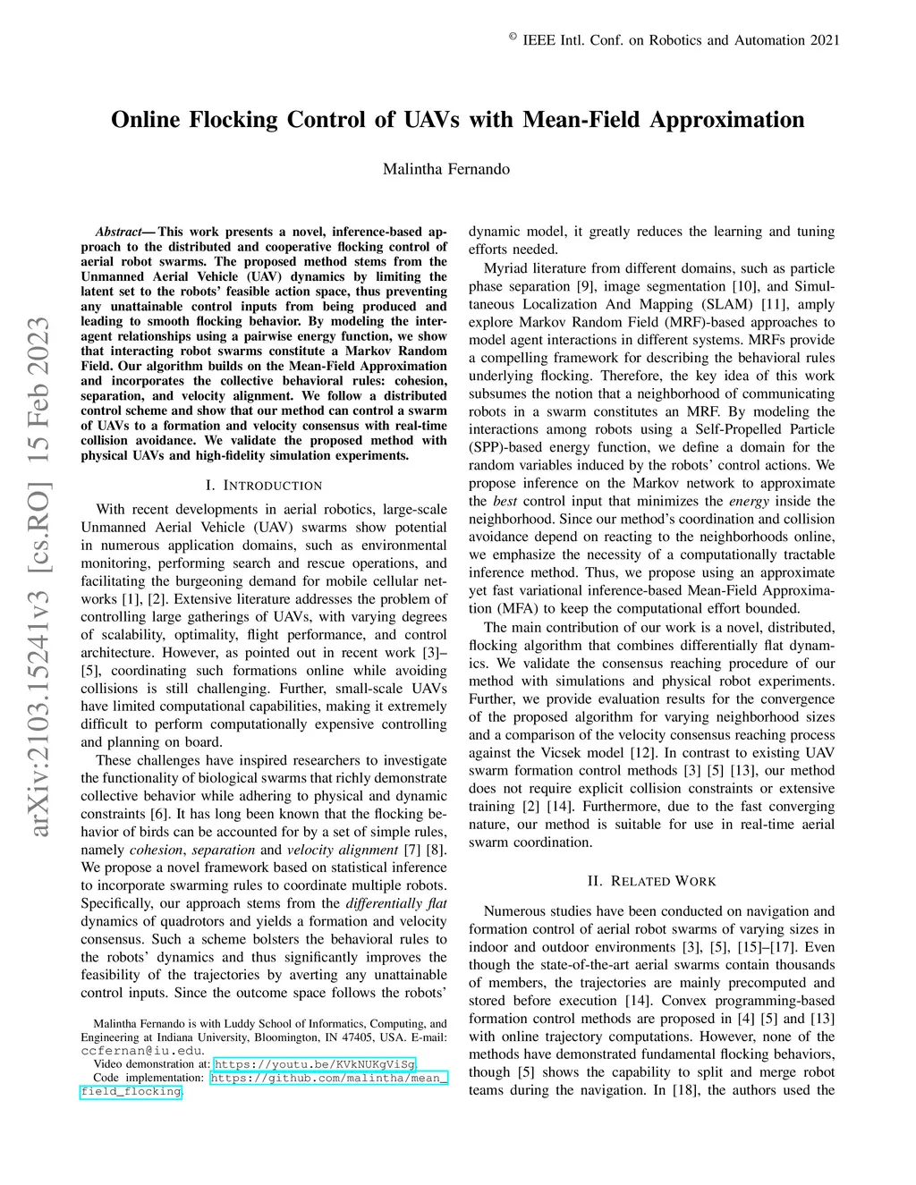 This work presents a novel, inference-based approach to the distributed and cooperative flocking control of aerial robot swarms. The proposed method stems from the Unmanned Aerial Vehicle (UAV) dynamics by limiting the latent set to the robots' feasible action space, thus preventing any unattainable control inputs from being produced and leading to smooth flocking behavior. By modeling the inter-agent relationships using a pairwise energy function, we show that interacting robot swarms constitute a Markov Random Field. Our algorithm builds on the Mean-Field Approximation and incorporates the collective behavioral rules: cohesion, separation, and velocity alignment. We follow a distributed control scheme and show that our method can control a swarm of UAVs to a formation and velocity consensus with real-time collision avoidance. We validate the proposed method with physical UAVs and high-fidelity simulation experiments.
