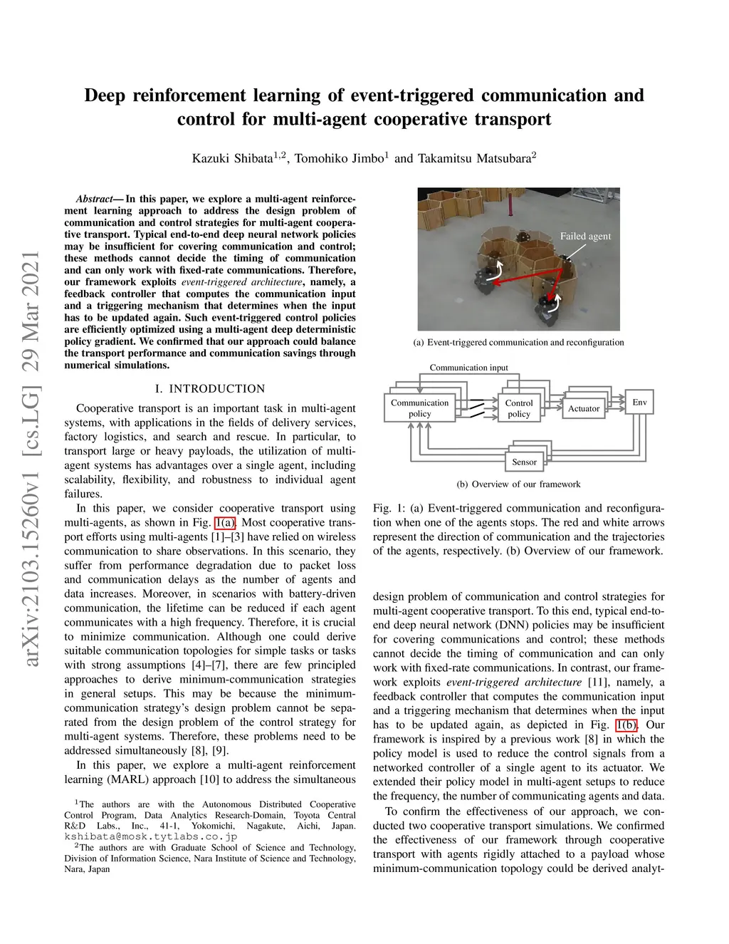 In this paper, we explore a multi-agent reinforcement learning approach to address the design problem of communication and control strategies for multi-agent cooperative transport. Typical end-to-end deep neural network policies may be insufficient for covering communication and control; these methods cannot decide the timing of communication and can only work with fixed-rate communications. Therefore, our framework exploits event-triggered architecture, namely, a feedback controller that computes the communication input and a triggering mechanism that determines when the input has to be updated again. Such event-triggered control policies are efficiently optimized using a multi-agent deep deterministic policy gradient. We confirmed that our approach could balance the transport performance and communication savings through numerical simulations.