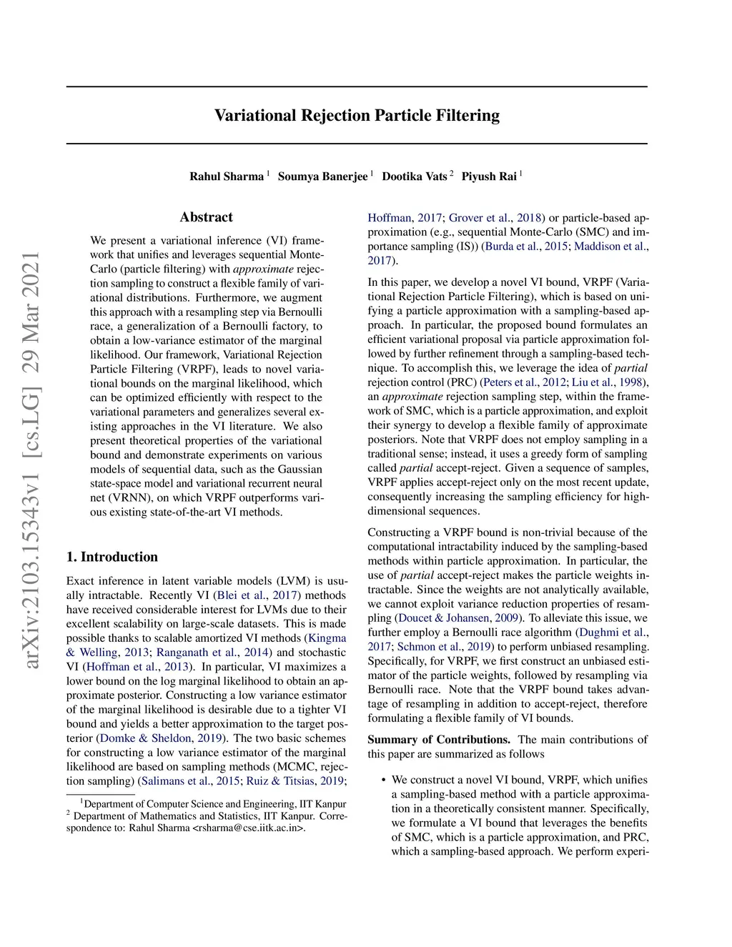 We present a variational inference (VI) framework that unifies and leverages sequential Monte-Carlo (particle filtering) with \emph{approximate} rejection sampling to construct a flexible family of variational distributions. Furthermore, we augment this approach with a resampling step via Bernoulli race, a generalization of a Bernoulli factory, to obtain a low-variance estimator of the marginal likelihood. Our framework, Variational Rejection Particle Filtering (VRPF), leads to novel variational bounds on the marginal likelihood, which can be optimized efficiently with respect to the variational parameters and generalizes several existing approaches in the VI literature. We also present theoretical properties of the variational bound and demonstrate experiments on various models of sequential data, such as the Gaussian state-space model and variational recurrent neural net (VRNN), on which VRPF outperforms various existing state-of-the-art VI methods.