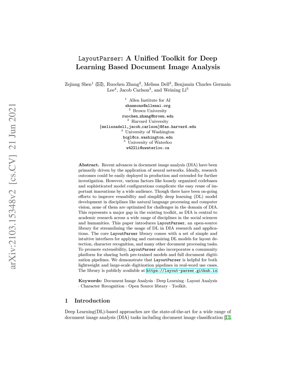 LayoutParser: A Unified Toolkit for Deep Learning Based Document Image