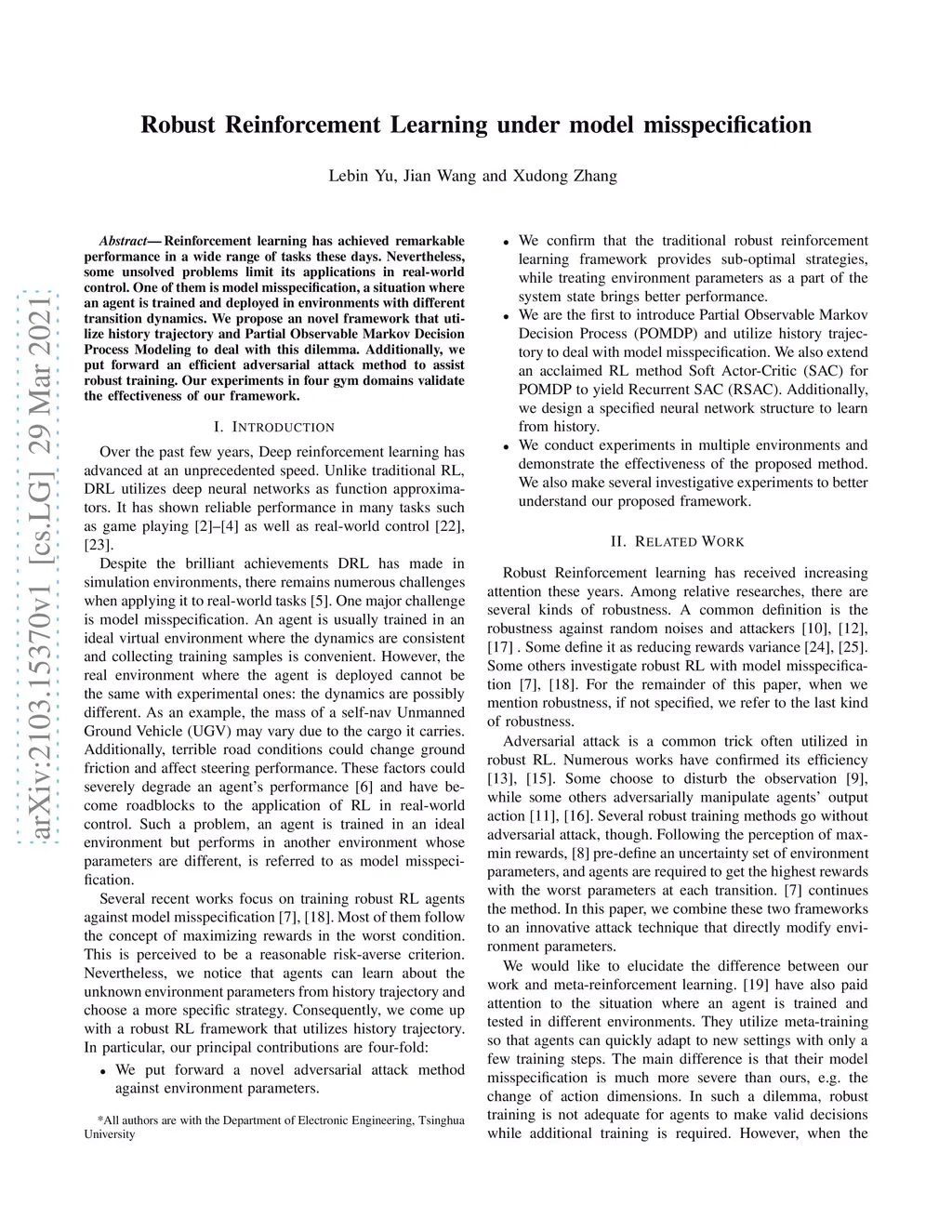 Reinforcement learning has achieved remarkable performance in a wide range of tasks these days. Nevertheless, some unsolved problems limit its applications in real-world control. One of them is model misspecification, a situation where an agent is trained and deployed in environments with different transition dynamics. We propose an novel framework that utilize history trajectory and Partial Observable Markov Decision Process Modeling to deal with this dilemma. Additionally, we put forward an efficient adversarial attack method to assist robust training. Our experiments in four gym domains validate the effectiveness of our framework.