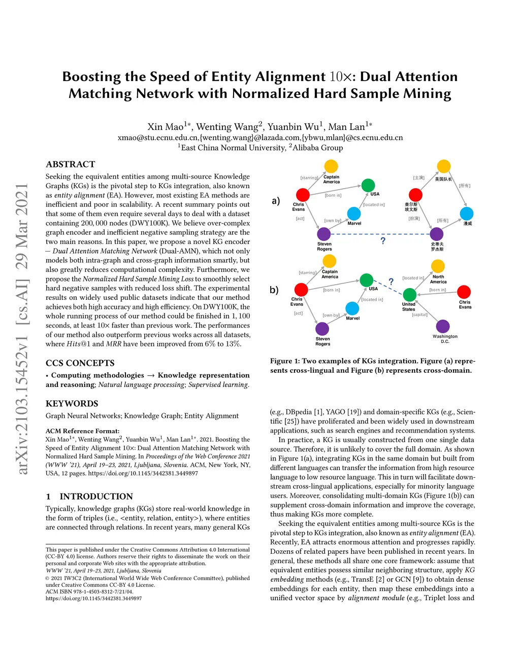 Seeking the equivalent entities among multi-source Knowledge Graphs (KGs) is the pivotal step to KGs integration, also known as \emph{entity alignment} (EA). However, most existing EA methods are inefficient and poor in scalability. A recent summary points out that some of them even require several days to deal with a dataset containing 200,000 nodes (DWY100K). We believe over-complex graph encoder and inefficient negative sampling strategy are the two main reasons. In this paper, we propose a novel KG encoder -- Dual Attention Matching Network (Dual-AMN), which not only models both intra-graph and cross-graph information smartly, but also greatly reduces computational complexity. Furthermore, we propose the Normalized Hard Sample Mining Loss to smoothly select hard negative samples with reduced loss shift. The experimental results on widely used public datasets indicate that our method achieves both high accuracy and high efficiency. On DWY100K, the whole running process of our method could be finished in 1,100 seconds, at least 10* faster than previous work. The performances of our method also outperform previous works across all datasets, where Hits@1 and MRR have been improved from 6% to 13%.