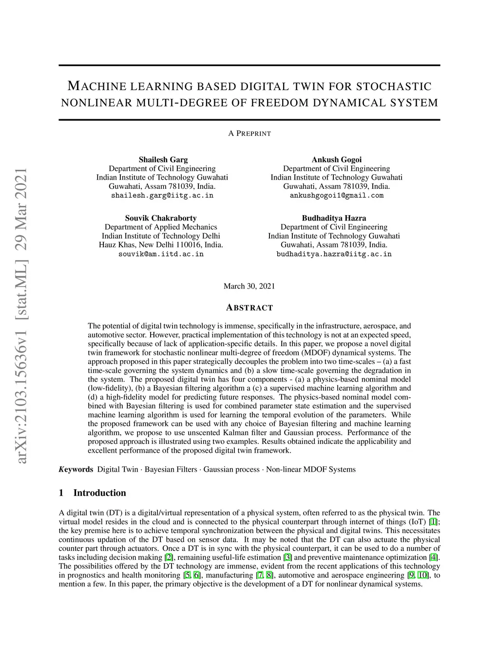 The potential of digital twin technology is immense, specifically in the infrastructure, aerospace, and automotive sector. However, practical implementation of this technology is not at an expected speed, specifically because of lack of application-specific details. In this paper, we propose a novel digital twin framework for stochastic nonlinear multi-degree of freedom (MDOF) dynamical systems. The approach proposed in this paper strategically decouples the problem into two time-scales -- (a) a fast time-scale governing the system dynamics and (b) a slow time-scale governing the degradation in the system. The proposed digital twin has four components - (a) a physics-based nominal model (low-fidelity), (b) a Bayesian filtering algorithm a (c) a supervised machine learning algorithm and (d) a high-fidelity model for predicting future responses. The physics-based nominal model combined with Bayesian filtering is used combined parameter state estimation and the supervised machine learning algorithm is used for learning the temporal evolution of the parameters. While the proposed framework can be used with any choice of Bayesian filtering and machine learning algorithm, we propose to use unscented Kalman filter and Gaussian process. Performance of the proposed approach is illustrated using two examples. Results obtained indicate the applicability and excellent performance of the proposed digital twin framework.