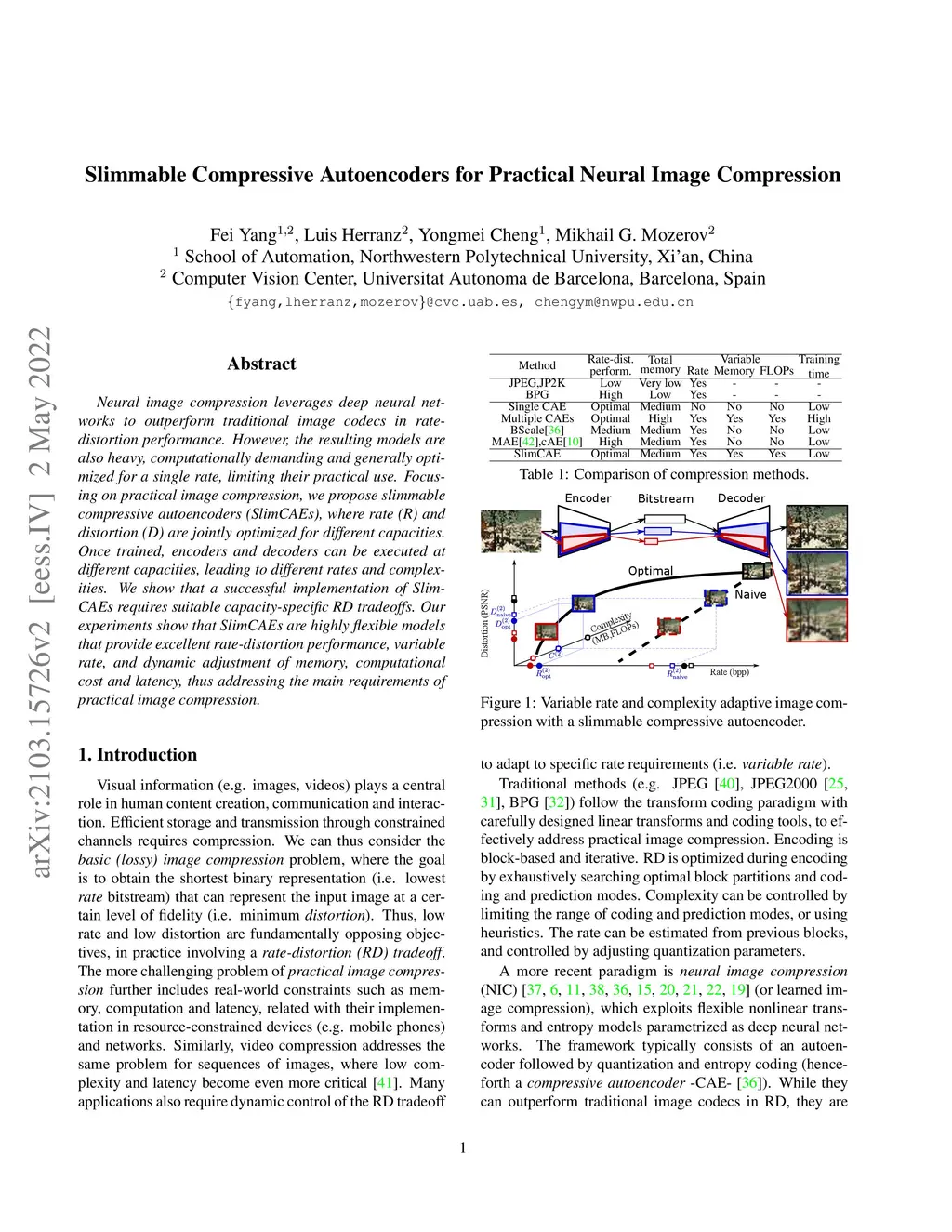 Neural image compression leverages deep neural networks to outperform traditional image codecs in rate-distortion performance. However, the resulting models are also heavy, computationally demanding and generally optimized for a single rate, limiting their practical use. Focusing on practical image compression, we propose slimmable compressive autoencoders (SlimCAEs), where rate (R) and distortion (D) are jointly optimized for different capacities. Once trained, encoders and decoders can be executed at different capacities, leading to different rates and complexities. We show that a successful implementation of SlimCAEs requires suitable capacity-specific RD tradeoffs. Our experiments show that SlimCAEs are highly flexible models that provide excellent rate-distortion performance, variable rate, and dynamic adjustment of memory, computational cost and latency, thus addressing the main requirements of practical image compression.