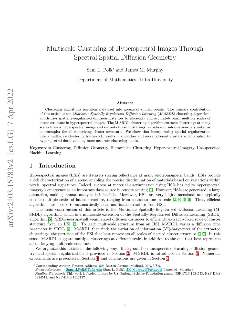 Clustering algorithms partition a dataset into groups of similar points. The primary contribution of this article is the Multiscale Spatially-Regularized Diffusion Learning (M-SRDL) clustering algorithm, which uses spatially-regularized diffusion distances to efficiently and accurately learn multiple scales of latent structure in hyperspectral images. The M-SRDL clustering algorithm extracts clusterings at many scales from a hyperspectral image and outputs these clusterings' variation of information-barycenter as an exemplar for all underlying cluster structure. We show that incorporating spatial regularization into a multiscale clustering framework results in smoother and more coherent clusters when applied to hyperspectral data, yielding more accurate clustering labels.