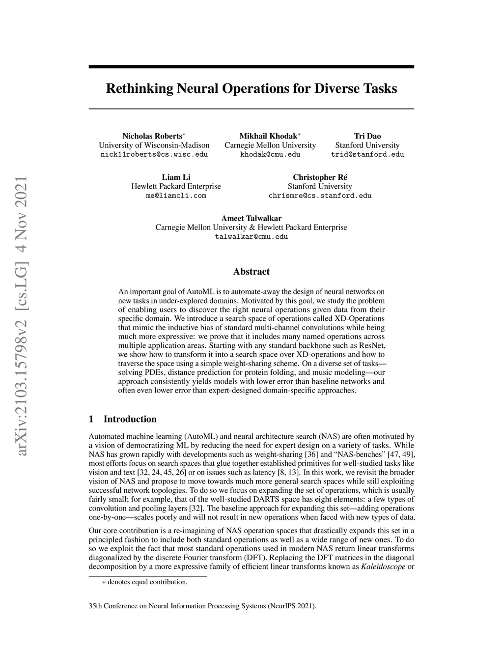 An important goal of AutoML is to automate-away the design of neural networks on new tasks in under-explored domains. Motivated by this goal, we study the problem of enabling users to discover the right neural operations given data from their specific domain. We introduce a search space of operations called XD-Operations that mimic the inductive bias of standard multi-channel convolutions while being much more expressive: we prove that it includes many named operations across multiple application areas. Starting with any standard backbone such as ResNet, we show how to transform it into a search space over XD-operations and how to traverse the space using a simple weight-sharing scheme. On a diverse set of tasks -- solving PDEs, distance prediction for protein folding, and music modeling -- our approach consistently yields models with lower error than baseline networks and often even lower error than expert-designed domain-specific approaches.