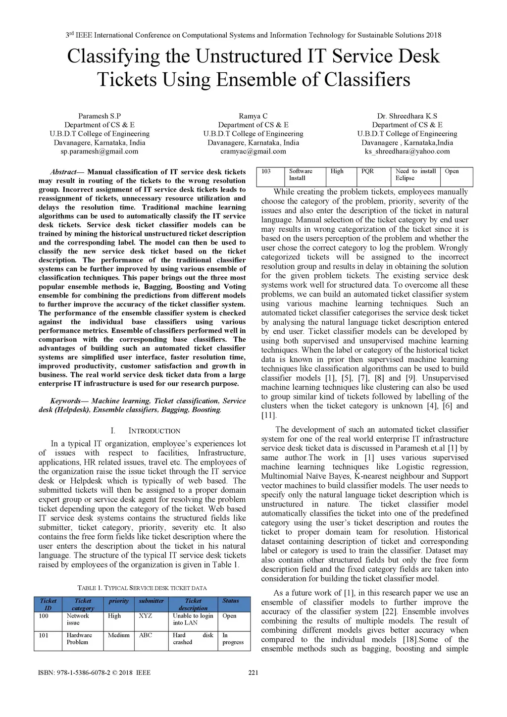 Classifying the Unstructured IT Service Desk Tickets Using Ensemble of