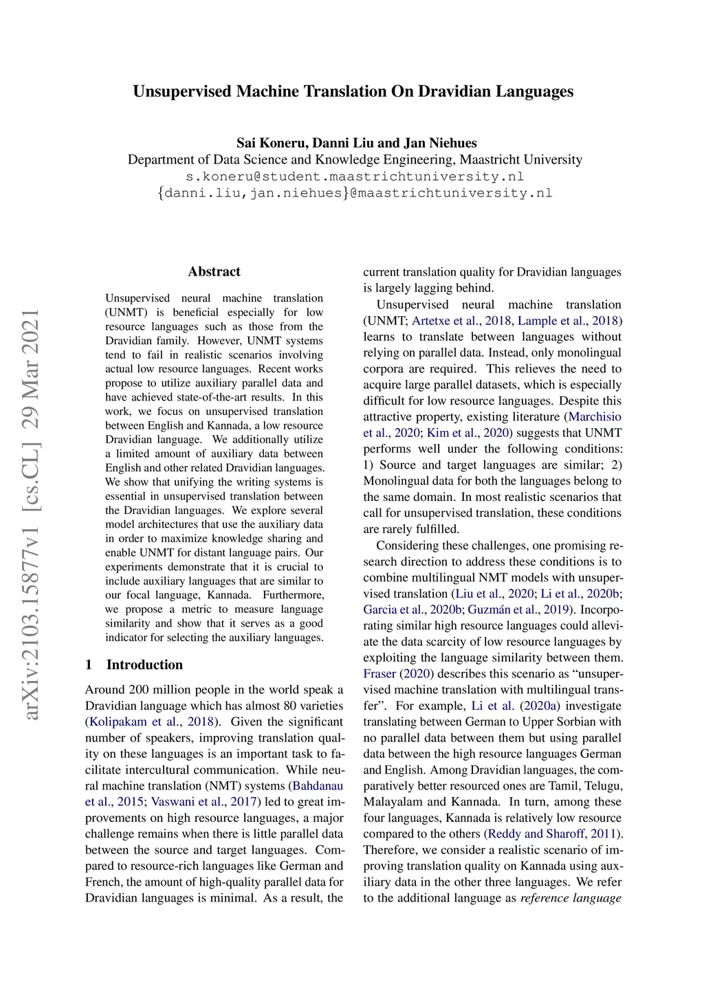 Unsupervised neural machine translation (UNMT) is beneficial especially for low resource languages such as those from the Dravidian family. However, UNMT systems tend to fail in realistic scenarios involving actual low resource languages. Recent works propose to utilize auxiliary parallel data and have achieved state-of-the-art results. In this work, we focus on unsupervised translation between English and Kannada, a low resource Dravidian language. We additionally utilize a limited amount of auxiliary data between English and other related Dravidian languages. We show that unifying the writing systems is essential in unsupervised translation between the Dravidian languages. We explore several model architectures that use the auxiliary data in order to maximize knowledge sharing and enable UNMT for distant language pairs. Our experiments demonstrate that it is crucial to include auxiliary languages that are similar to our focal language, Kannada. Furthermore, we propose a metric to measure language similarity and show that it serves as a good indicator for selecting the auxiliary languages.