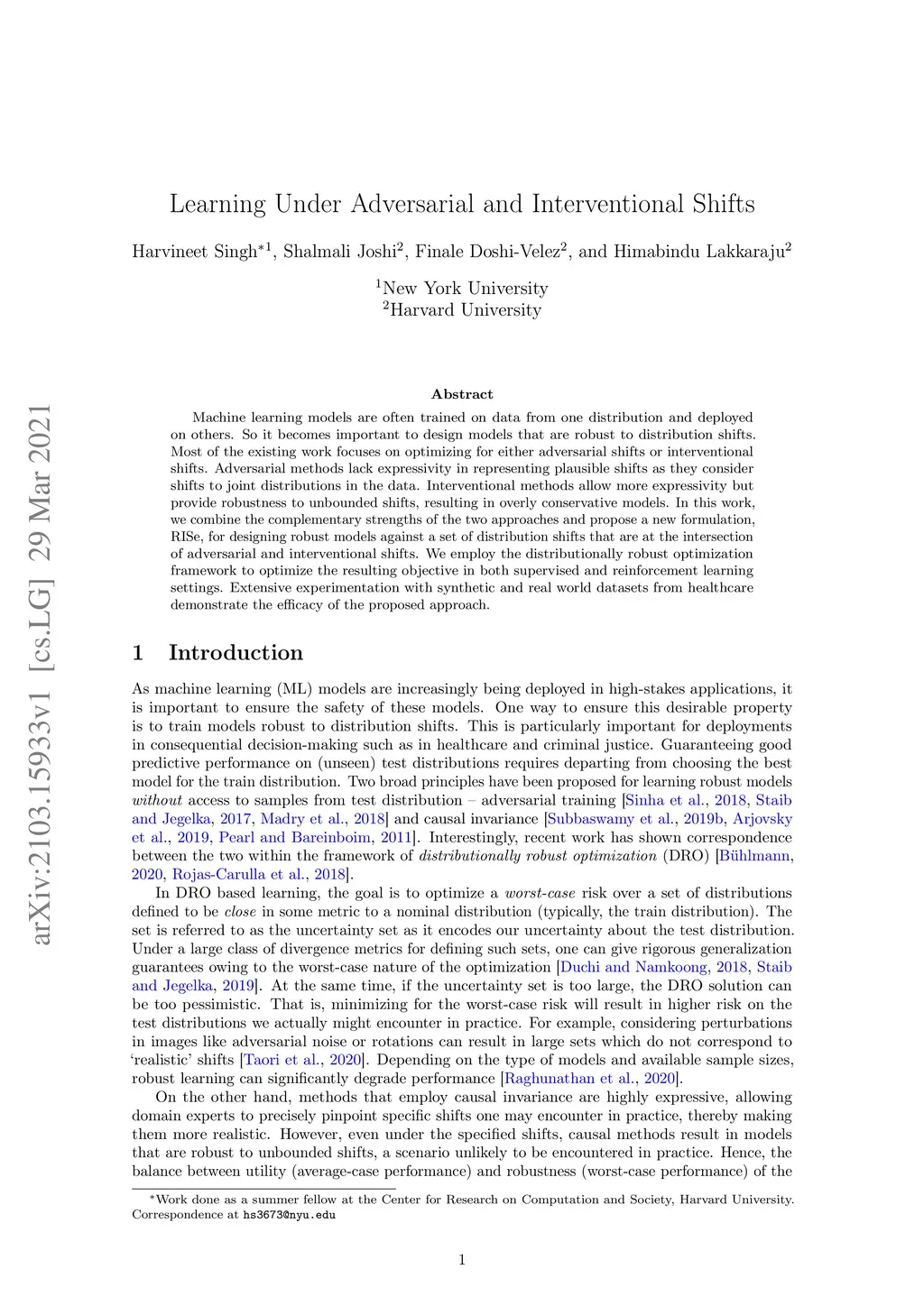 Machine learning models are often trained on data from one distribution and deployed on others. So it becomes important to design models that are robust to distribution shifts. Most of the existing work focuses on optimizing for either adversarial shifts or interventional shifts. Adversarial methods lack expressivity in representing plausible shifts as they consider shifts to joint distributions in the data. Interventional methods allow more expressivity but provide robustness to unbounded shifts, resulting in overly conservative models. In this work, we combine the complementary strengths of the two approaches and propose a new formulation, RISe, for designing robust models against a set of distribution shifts that are at the intersection of adversarial and interventional shifts. We employ the distributionally robust optimization framework to optimize the resulting objective in both supervised and reinforcement learning settings. Extensive experimentation with synthetic and real world datasets from healthcare demonstrate the efficacy of the proposed approach.