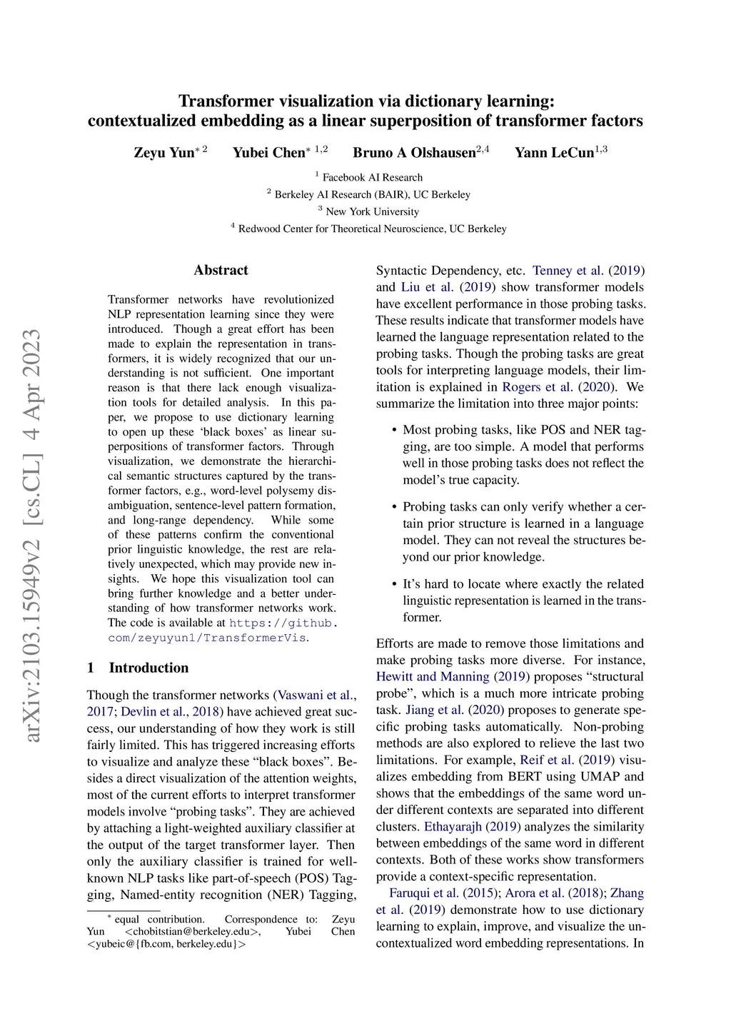 Transformer networks have revolutionized NLP representation learning since they were introduced. Though a great effort has been made to explain the representation in transformers, it is widely recognized that our understanding is not sufficient. One important reason is that there lack enough visualization tools for detailed analysis. In this paper, we propose to use dictionary learning to open up these "black boxes" as linear superpositions of transformer factors. Through visualization, we demonstrate the hierarchical semantic structures captured by the transformer factors, e.g., word-level polysemy disambiguation, sentence-level pattern formation, and long-range dependency. While some of these patterns confirm the conventional prior linguistic knowledge, the rest are relatively unexpected, which may provide new insights. We hope this visualization tool can bring further knowledge and a better understanding of how transformer networks work. The code is available at https://github.com/zeyuyun1/TransformerVis