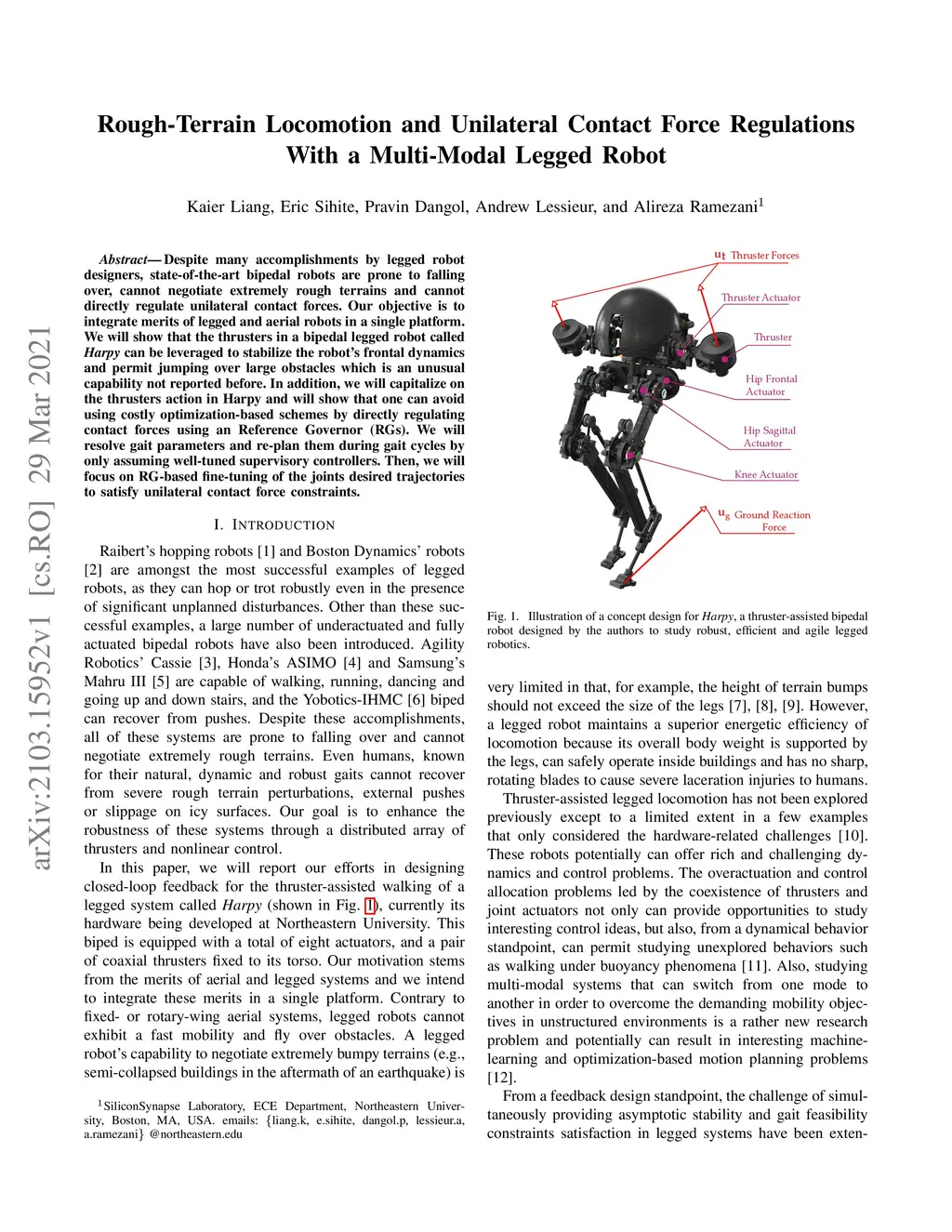 Despite many accomplishments by legged robot designers, state-of-the-art bipedal robots are prone to falling over, cannot negotiate extremely rough terrains and cannot directly regulate unilateral contact forces. Our objective is to integrate merits of legged and aerial robots in a single platform. We will show that the thrusters in a bipedal legged robot called Harpy can be leveraged to stabilize the robot's frontal dynamics and permit jumping over large obstacles which is an unusual capability not reported before. In addition, we will capitalize on the thrusters action in Harpy and will show that one can avoid using costly optimization-based schemes by directly regulating contact forces using an Reference Governor (RGs). We will resolve gait parameters and re-plan them during gait cycles by only assuming well-tuned supervisory controllers. Then, we will focus on RG-based fine-tuning of the joints desired trajectories to satisfy unilateral contact force constraints.