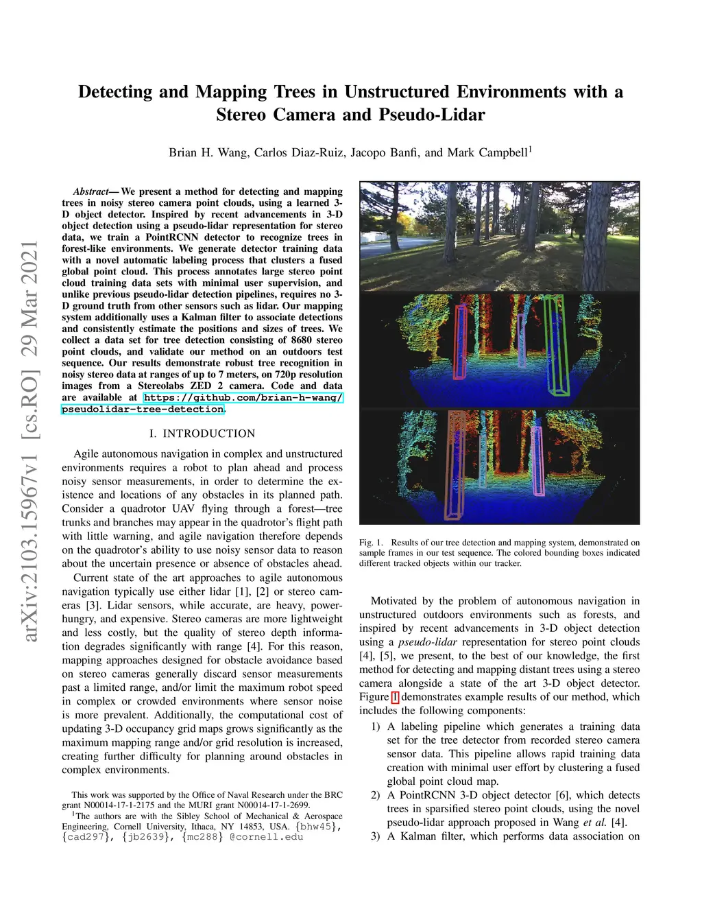 We present a method for detecting and mapping trees in noisy stereo camera point clouds, using a learned 3-D object detector. Inspired by recent advancements in 3-D object detection using a pseudo-lidar representation for stereo data, we train a PointRCNN detector to recognize trees in forest-like environments. We generate detector training data with a novel automatic labeling process that clusters a fused global point cloud. This process annotates large stereo point cloud training data sets with minimal user supervision, and unlike previous pseudo-lidar detection pipelines, requires no 3-D ground truth from other sensors such as lidar. Our mapping system additionally uses a Kalman filter to associate detections and consistently estimate the positions and sizes of trees. We collect a data set for tree detection consisting of 8680 stereo point clouds, and validate our method on an outdoors test sequence. Our results demonstrate robust tree recognition in noisy stereo data at ranges of up to 7 meters, on 720p resolution images from a Stereolabs ZED 2 camera. Code and data are available at https://github.com/brian-h-wang/pseudolidar-tree-detection.