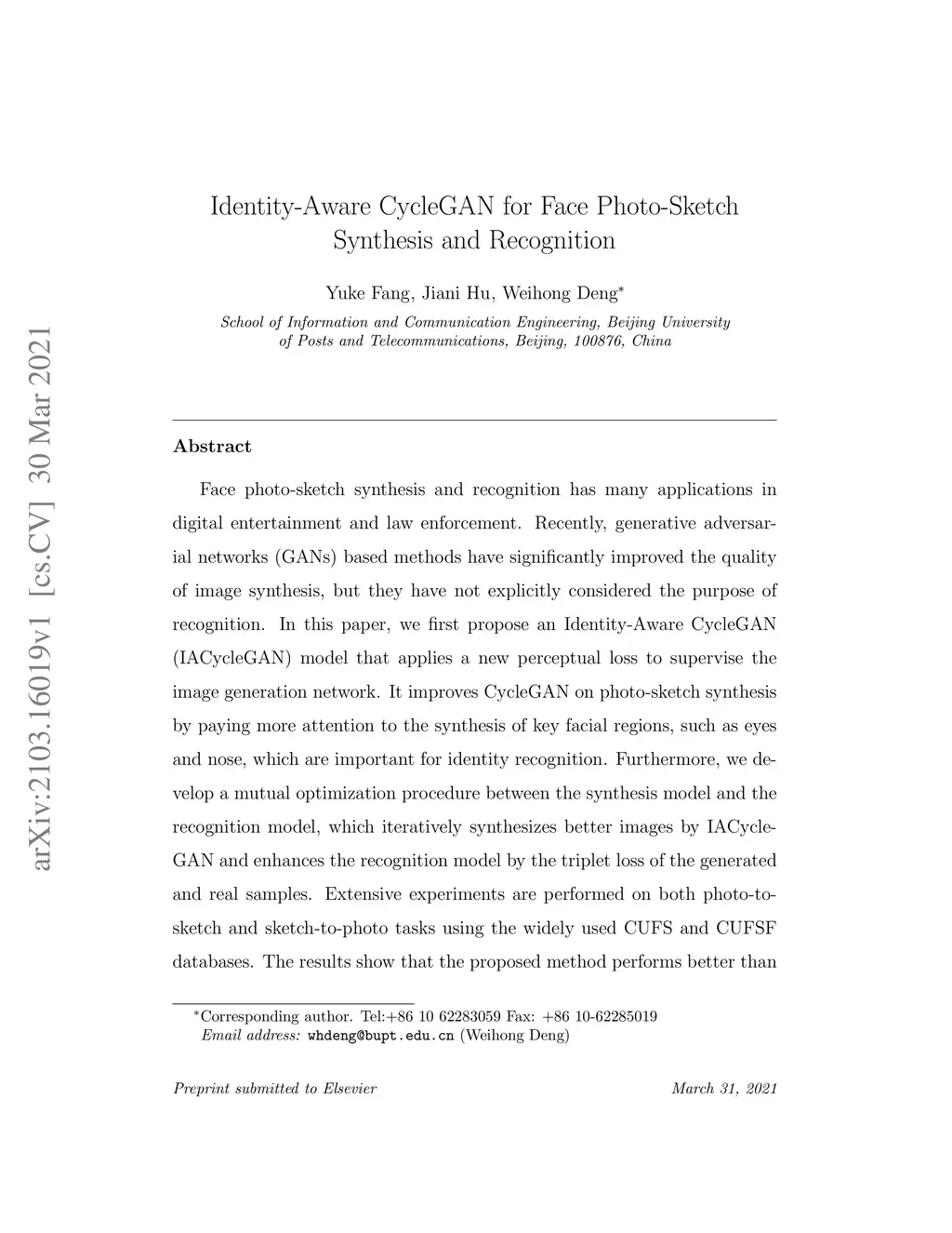 Identity-Aware CycleGAN for Face Photo-Sketch Synthesis and Recognition