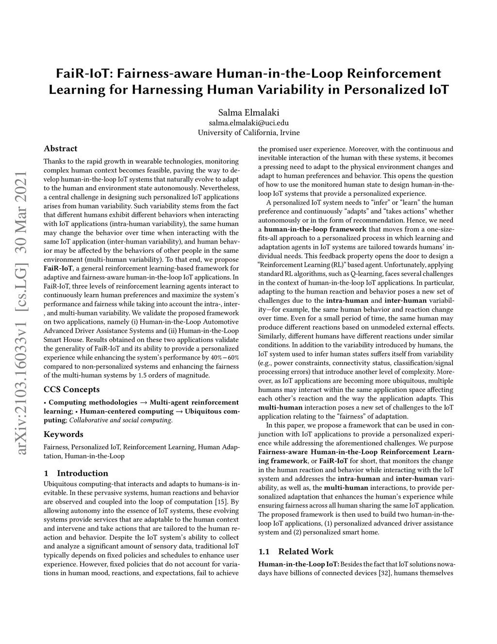 Thanks to the rapid growth in wearable technologies, monitoring complex human context becomes feasible, paving the way to develop human-in-the-loop IoT systems that naturally evolve to adapt to the human and environment state autonomously. Nevertheless, a central challenge in designing such personalized IoT applications arises from human variability. Such variability stems from the fact that different humans exhibit different behaviors when interacting with IoT applications (intra-human variability), the same human may change the behavior over time when interacting with the same IoT application (inter-human variability), and human behavior may be affected by the behaviors of other people in the same environment (multi-human variability). To that end, we propose FaiR-IoT, a general reinforcement learning-based framework for adaptive and fairness-aware human-in-the-loop IoT applications. In FaiR-IoT, three levels of reinforcement learning agents interact to continuously learn human preferences and maximize the system's performance and fairness while taking into account the intra-, inter-, and multi-human variability. We validate the proposed framework on two applications, namely (i) Human-in-the-Loop Automotive Advanced Driver Assistance Systems and (ii) Human-in-the-Loop Smart House. Results obtained on these two applications validate the generality of FaiR-IoT and its ability to provide a personalized experience while enhancing the system's performance by 40%-60% compared to non-personalized systems and enhancing the fairness of the multi-human systems by 1.5 orders of magnitude.