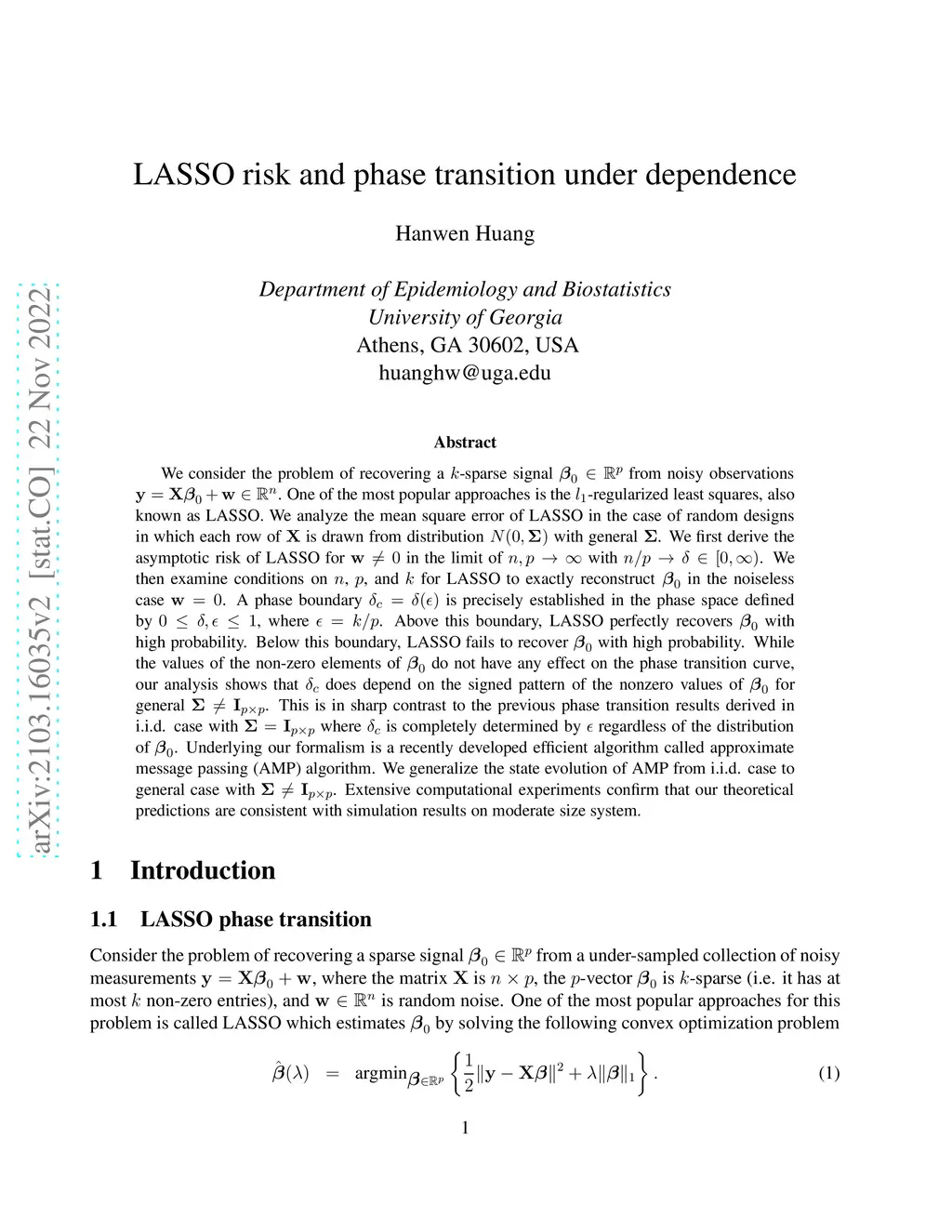 We consider the problem of recovering a -sparse signal {\mbox{\beta}}_0\in\mathbb{R}^p from noisy observations \bf y={\bf X}\mbox{\beta}_0+{\bf w}\in\mathbb{R}^n. One of the most popular approaches is the -regularized least squares, also known as LASSO. We analyze the mean square error of LASSO in the case of random designs in which each row of is drawn from distribution N(0,{\mbox{\Sigma}}) with general {\mbox{\Sigma}}. We first derive the asymptotic risk of LASSO in the limit of with . We then examine conditions on , , and for LASSO to exactly reconstruct {\mbox{\beta}}_0 in the noiseless case . A phase boundary is precisely established in the phase space defined by , where . Above this boundary, LASSO perfectly recovers {\mbox{\beta}}_0 with high probability. Below this boundary, LASSO fails to recover \mbox{\beta}_0 with high probability. While the values of the non-zero elements of {\mbox{\beta}}_0 do not have any effect on the phase transition curve, our analysis shows that does depend on the signed pattern of the nonzero values of \mbox{\beta}_0 for general {\mbox{\Sigma}}\ne{\bf I}_p. This is in sharp contrast to the previous phase transition results derived in i.i.d. case with \mbox{\Sigma}={\bf I}_p where is completely determined by regardless of the distribution of \mbox{\beta}_0. Underlying our formalism is a recently developed efficient algorithm called approximate message passing (AMP) algorithm. We generalize the state evolution of AMP from i.i.d. case to general case with {\mbox{\Sigma}}\ne{\bf I}_p. Extensive computational experiments confirm that our theoretical predictions are consistent with simulation results on moderate size system.