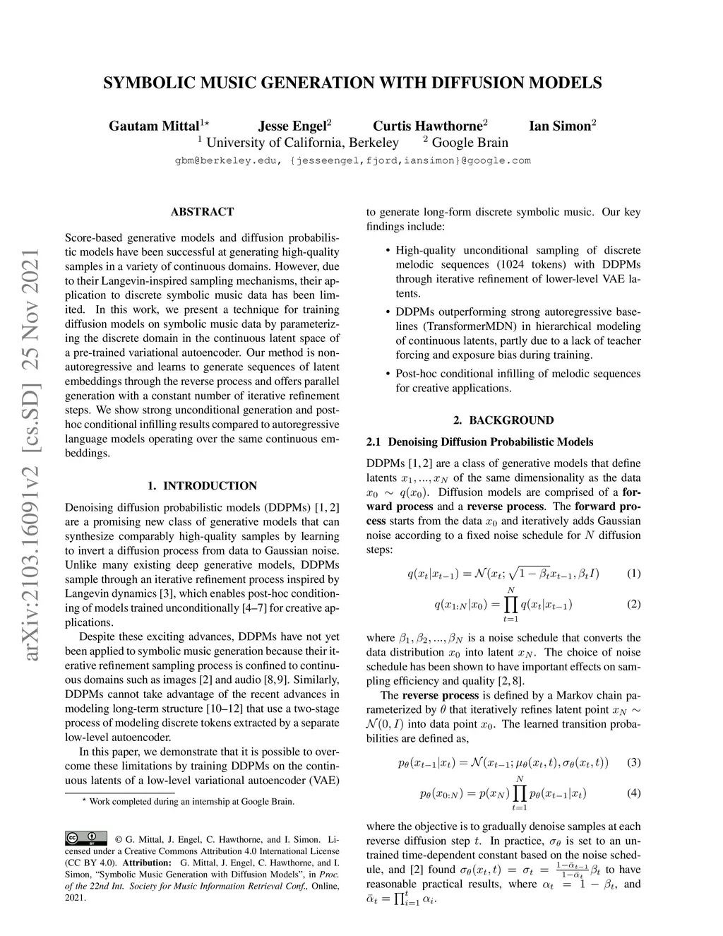 Score-based generative models and diffusion probabilistic models have been successful at generating high-quality samples in continuous domains such as images and audio. However, due to their Langevin-inspired sampling mechanisms, their application to discrete and sequential data has been limited. In this work, we present a technique for training diffusion models on sequential data by parameterizing the discrete domain in the continuous latent space of a pre-trained variational autoencoder. Our method is non-autoregressive and learns to generate sequences of latent embeddings through the reverse process and offers parallel generation with a constant number of iterative refinement steps. We apply this technique to modeling symbolic music and show strong unconditional generation and post-hoc conditional infilling results compared to autoregressive language models operating over the same continuous embeddings.