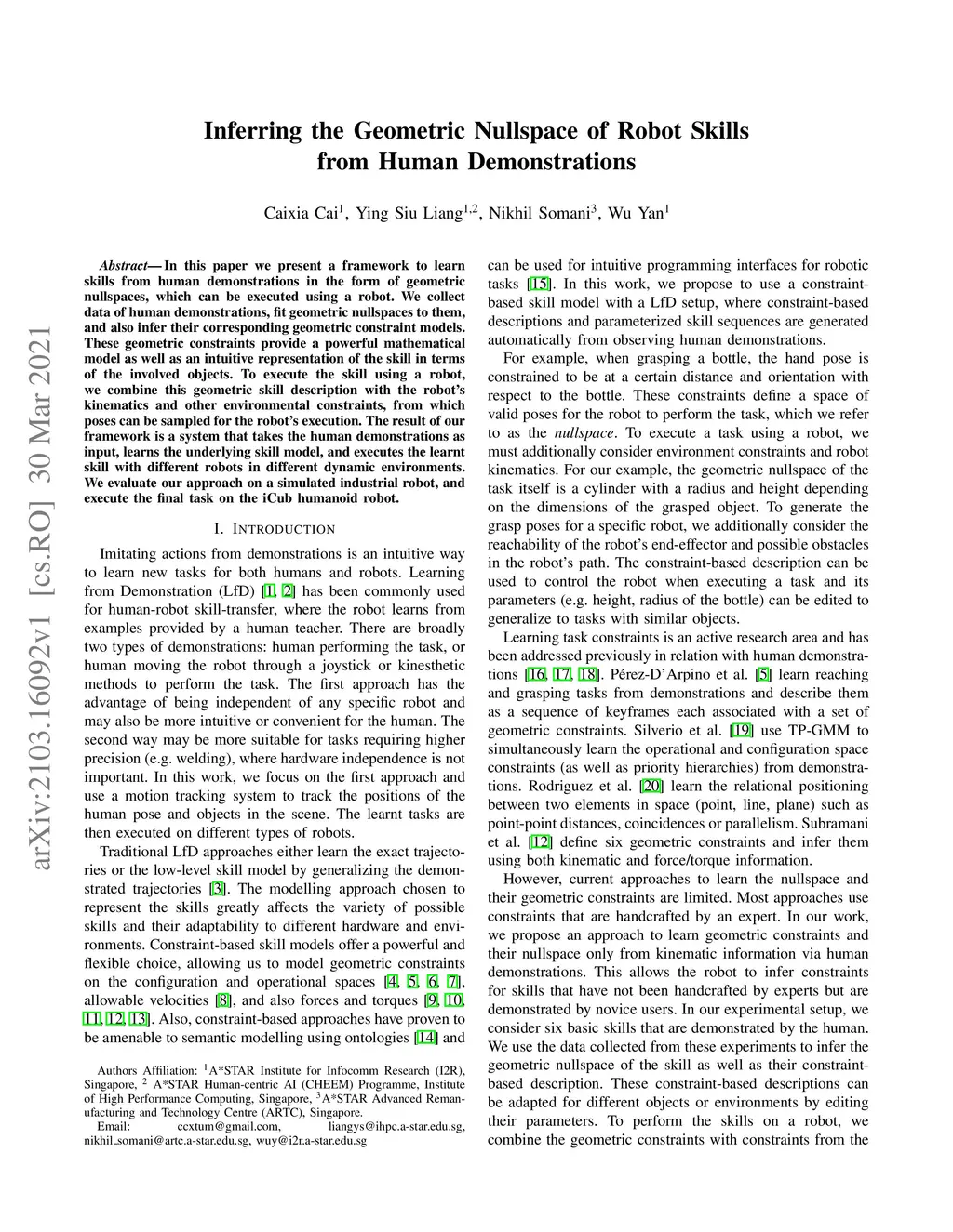 In this paper we present a framework to learn skills from human demonstrations in the form of geometric nullspaces, which can be executed using a robot. We collect data of human demonstrations, fit geometric nullspaces to them, and also infer their corresponding geometric constraint models. These geometric constraints provide a powerful mathematical model as well as an intuitive representation of the skill in terms of the involved objects. To execute the skill using a robot, we combine this geometric skill description with the robot's kinematics and other environmental constraints, from which poses can be sampled for the robot's execution. The result of our framework is a system that takes the human demonstrations as input, learns the underlying skill model, and executes the learnt skill with different robots in different dynamic environments. We evaluate our approach on a simulated industrial robot, and execute the final task on the iCub humanoid robot.