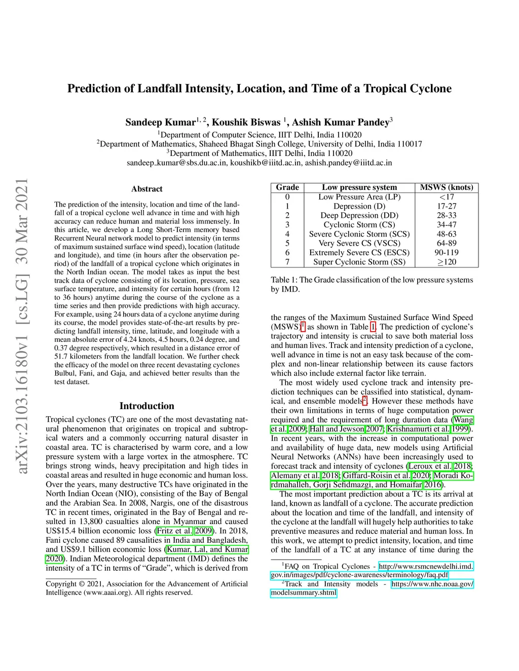 The prediction of the intensity, location and time of the landfall of a tropical cyclone well advance in time and with high accuracy can reduce human and material loss immensely. In this article, we develop a Long Short-Term memory based Recurrent Neural network model to predict intensity (in terms of maximum sustained surface wind speed), location (latitude and longitude), and time (in hours after the observation period) of the landfall of a tropical cyclone which originates in the North Indian ocean. The model takes as input the best track data of cyclone consisting of its location, pressure, sea surface temperature, and intensity for certain hours (from 12 to 36 hours) anytime during the course of the cyclone as a time series and then provide predictions with high accuracy. For example, using 24 hours data of a cyclone anytime during its course, the model provides state-of-the-art results by predicting landfall intensity, time, latitude, and longitude with a mean absolute error of 4.24 knots, 4.5 hours, 0.24 degree, and 0.37 degree respectively, which resulted in a distance error of 51.7 kilometers from the landfall location. We further check the efficacy of the model on three recent devastating cyclones Bulbul, Fani, and Gaja, and achieved better results than the test dataset.