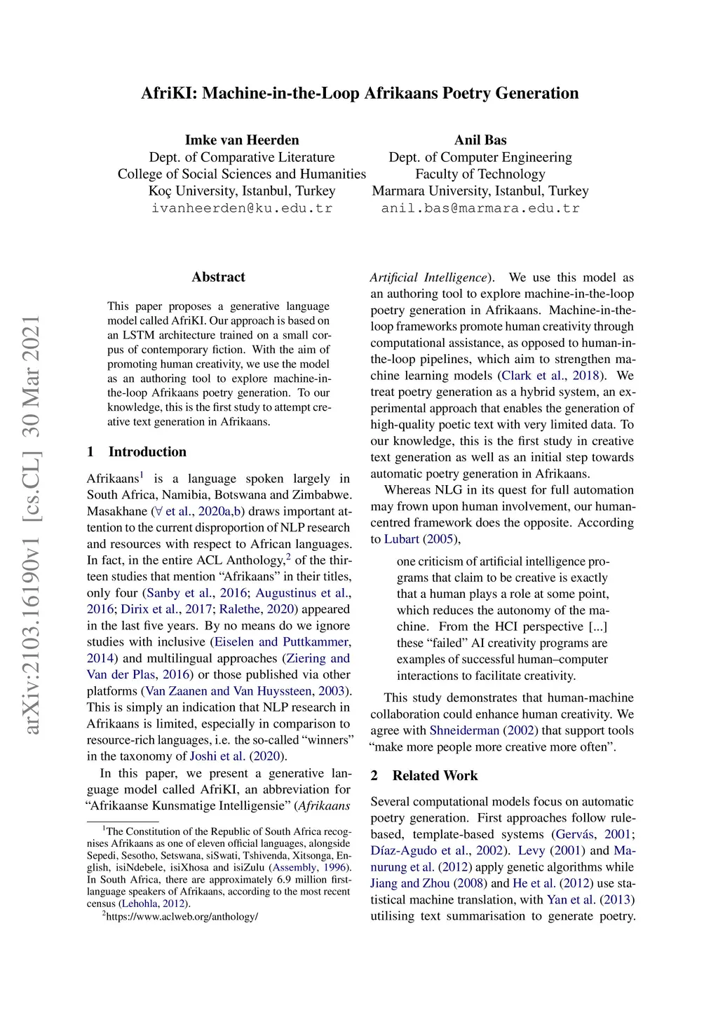 This paper proposes a generative language model called AfriKI. Our approach is based on an LSTM architecture trained on a small corpus of contemporary fiction. With the aim of promoting human creativity, we use the model as an authoring tool to explore machine-in-the-loop Afrikaans poetry generation. To our knowledge, this is the first study to attempt creative text generation in Afrikaans.