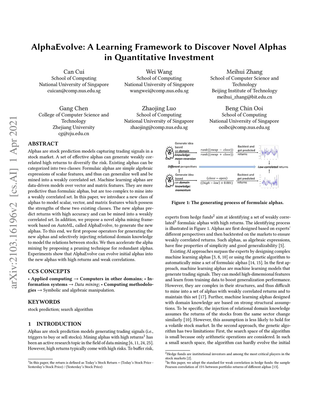 Alphas are stock prediction models capturing trading signals in a stock market. A set of effective alphas can generate weakly correlated high returns to diversify the risk. Existing alphas can be categorized into two classes: Formulaic alphas are simple algebraic expressions of scalar features, and thus can generalize well and be mined into a weakly correlated set. Machine learning alphas are data-driven models over vector and matrix features. They are more predictive than formulaic alphas, but are too complex to mine into a weakly correlated set. In this paper, we introduce a new class of alphas to model scalar, vector, and matrix features which possess the strengths of these two existing classes. The new alphas predict returns with high accuracy and can be mined into a weakly correlated set. In addition, we propose a novel alpha mining framework based on AutoML, called AlphaEvolve, to generate the new alphas. To this end, we first propose operators for generating the new alphas and selectively injecting relational domain knowledge to model the relations between stocks. We then accelerate the alpha mining by proposing a pruning technique for redundant alphas. Experiments show that AlphaEvolve can evolve initial alphas into the new alphas with high returns and weak correlations.