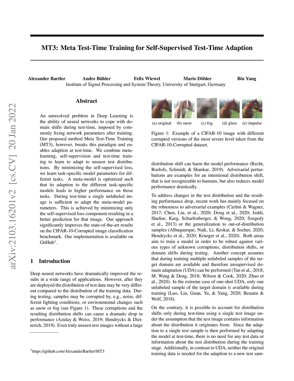 An unresolved problem in Deep Learning is the ability of neural networks to cope with domain shifts during test-time, imposed by commonly fixing network parameters after training. Our proposed method Meta Test-Time Training (MT3), however, breaks this paradigm and enables adaption at test-time. We combine meta-learning, self-supervision and test-time training to learn to adapt to unseen test distributions. By minimizing the self-supervised loss, we learn task-specific model parameters for different tasks. A meta-model is optimized such that its adaption to the different task-specific models leads to higher performance on those tasks. During test-time a single unlabeled image is sufficient to adapt the meta-model parameters. This is achieved by minimizing only the self-supervised loss component resulting in a better prediction for that image. Our approach significantly improves the state-of-the-art results on the CIFAR-10-Corrupted image classification benchmark. Our implementation is available on GitHub.