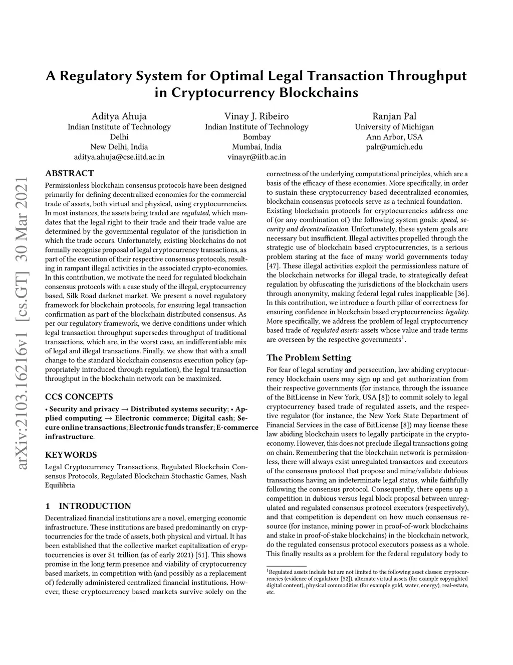 Permissionless blockchain consensus protocols have been designed primarily for defining decentralized economies for the commercial trade of assets, both virtual and physical, using cryptocurrencies. In most instances, the assets being traded are regulated, which mandates that the legal right to their trade and their trade value are determined by the governmental regulator of the jurisdiction in which the trade occurs. Unfortunately, existing blockchains do not formally recognise proposal of legal cryptocurrency transactions, as part of the execution of their respective consensus protocols, resulting in rampant illegal activities in the associated crypto-economies. In this contribution, we motivate the need for regulated blockchain consensus protocols with a case study of the illegal, cryptocurrency based, Silk Road darknet market. We present a novel regulatory framework for blockchain protocols, for ensuring legal transaction confirmation as part of the blockchain distributed consensus. As per our regulatory framework, we derive conditions under which legal transaction throughput supersedes throughput of traditional transactions, which are, in the worst case, an indifferentiable mix of legal and illegal transactions. Finally, we show that with a small change to the standard blockchain consensus execution policy (appropriately introduced through regulation), the legal transaction throughput in the blockchain network can be maximized.