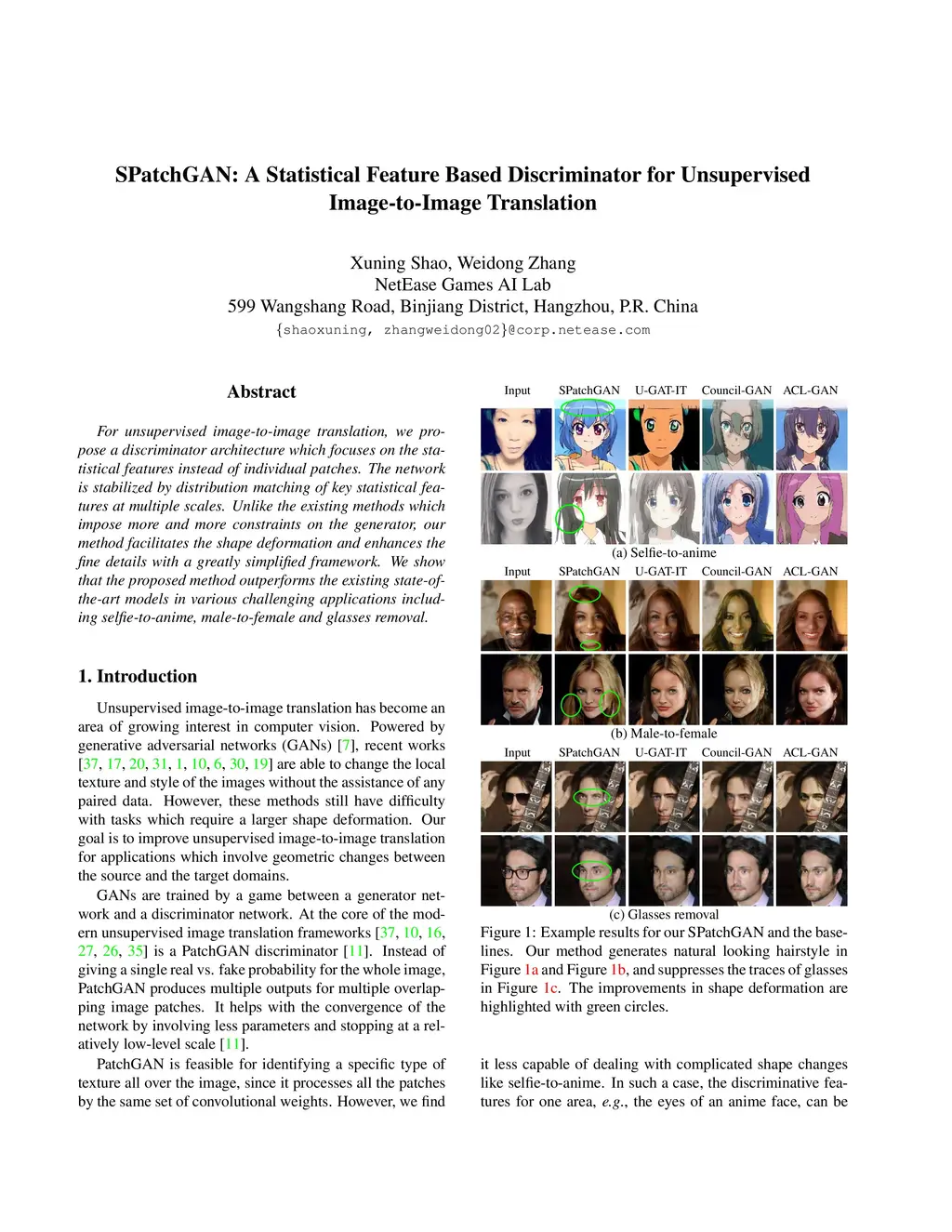 For unsupervised image-to-image translation, we propose a discriminator architecture which focuses on the statistical features instead of individual patches. The network is stabilized by distribution matching of key statistical features at multiple scales. Unlike the existing methods which impose more and more constraints on the generator, our method facilitates the shape deformation and enhances the fine details with a greatly simplified framework. We show that the proposed method outperforms the existing state-of-the-art models in various challenging applications including selfie-to-anime, male-to-female and glasses removal.