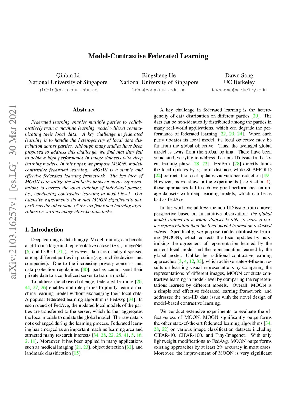 Federated learning enables multiple parties to collaboratively train a machine learning model without communicating their local data. A key challenge in federated learning is to handle the heterogeneity of local data distribution across parties. Although many studies have been proposed to address this challenge, we find that they fail to achieve high performance in image datasets with deep learning models. In this paper, we propose MOON: model-contrastive federated learning. MOON is a simple and effective federated learning framework. The key idea of MOON is to utilize the similarity between model representations to correct the local training of individual parties, i.e., conducting contrastive learning in model-level. Our extensive experiments show that MOON significantly outperforms the other state-of-the-art federated learning algorithms on various image classification tasks.