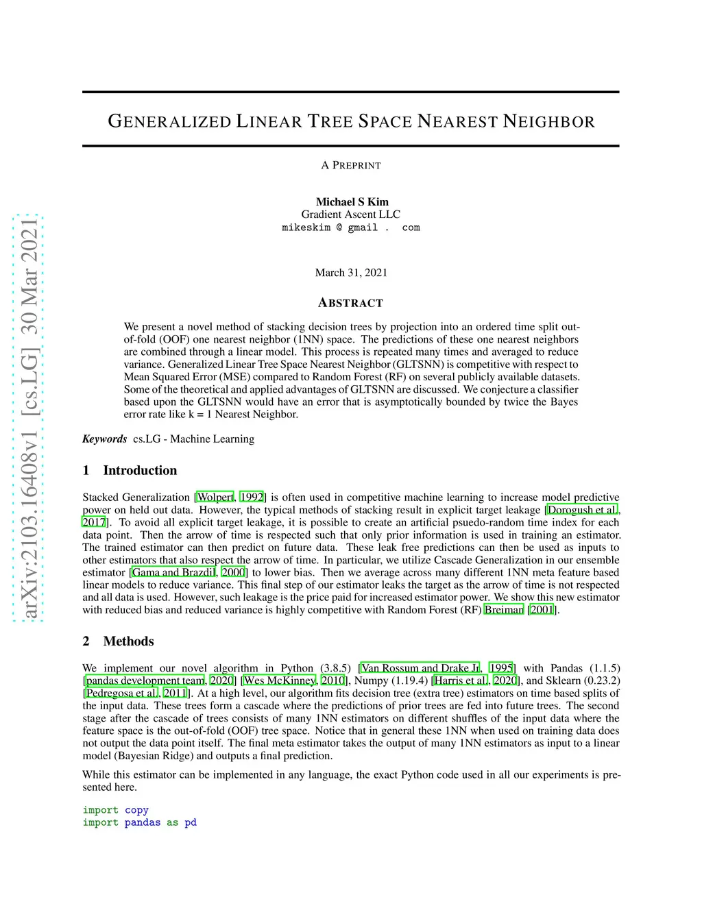 We present a novel method of stacking decision trees by projection into an ordered time split out-of-fold (OOF) one nearest neighbor (1NN) space. The predictions of these one nearest neighbors are combined through a linear model. This process is repeated many times and averaged to reduce variance. Generalized Linear Tree Space Nearest Neighbor (GLTSNN) is competitive with respect to Mean Squared Error (MSE) compared to Random Forest (RF) on several publicly available datasets. Some of the theoretical and applied advantages of GLTSNN are discussed. We conjecture a classifier based upon the GLTSNN would have an error that is asymptotically bounded by twice the Bayes error rate like k = 1 Nearest Neighbor.