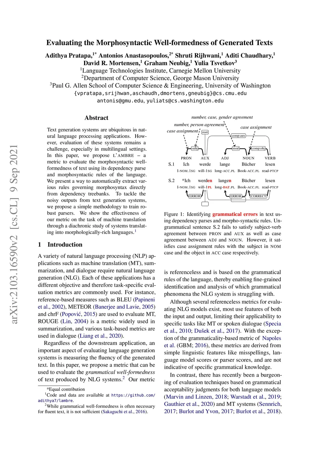 Text generation systems are ubiquitous in natural language processing applications. However, evaluation of these systems remains a challenge, especially in multilingual settings. In this paper, we propose LÁMBRE -- a metric to evaluate the morphosyntactic well-formedness of text using its dependency parse and morphosyntactic rules of the language. We present a way to automatically extract various rules governing morphosyntax directly from dependency treebanks. To tackle the noisy outputs from text generation systems, we propose a simple methodology to train robust parsers. We show the effectiveness of our metric on the task of machine translation through a diachronic study of systems translating into morphologically-rich languages.