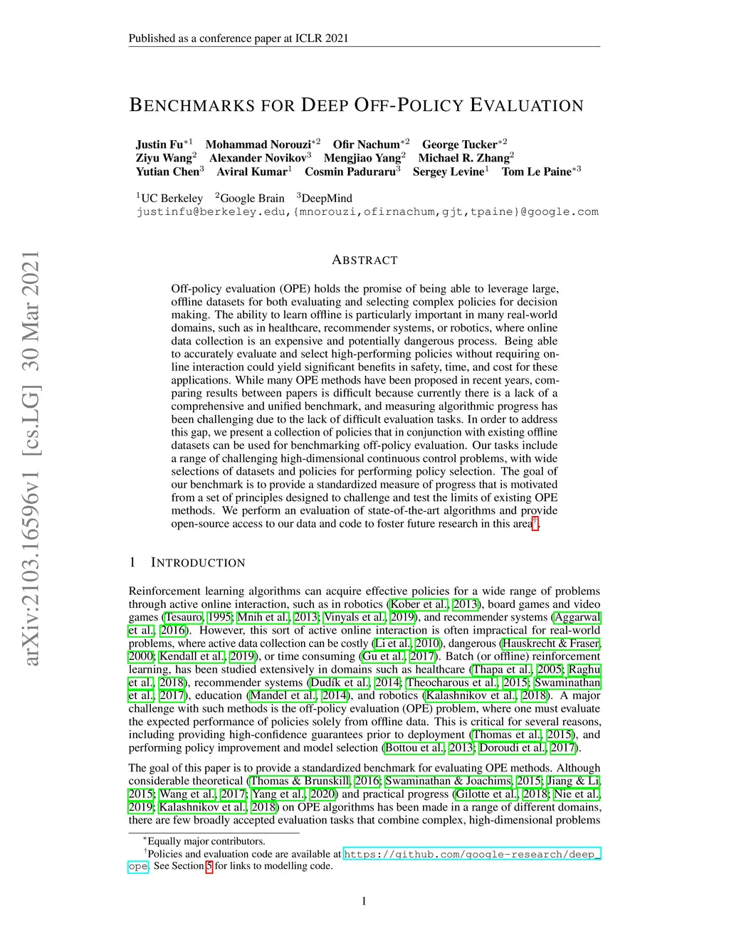 Benchmarks for Deep Off-Policy Evaluation
