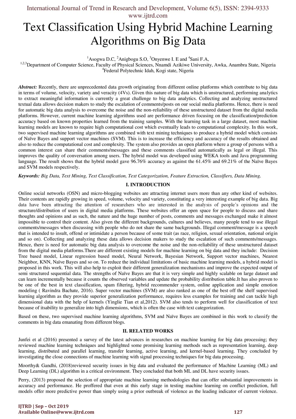 Text Classification Using Hybrid Machine Learning Algorithms on Big Data