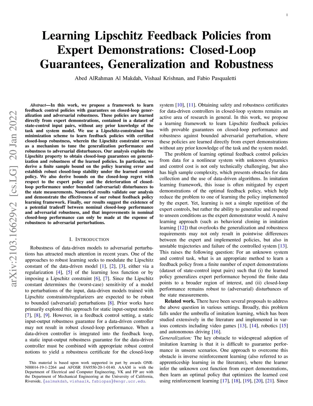 Learning Lipschitz Feedback Policies from Expert Demonstrations: