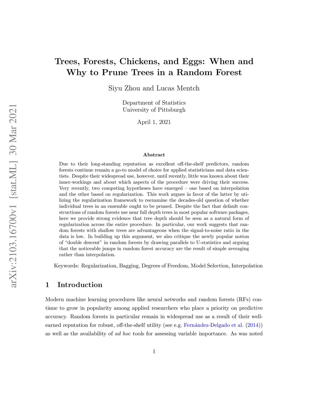 Due to their long-standing reputation as excellent off-the-shelf predictors, random forests continue remain a go-to model of choice for applied statisticians and data scientists. Despite their widespread use, however, until recently, little was known about their inner-workings and about which aspects of the procedure were driving their success. Very recently, two competing hypotheses have emerged -- one based on interpolation and the other based on regularization. This work argues in favor of the latter by utilizing the regularization framework to reexamine the decades-old question of whether individual trees in an ensemble ought to be pruned. Despite the fact that default constructions of random forests use near full depth trees in most popular software packages, here we provide strong evidence that tree depth should be seen as a natural form of regularization across the entire procedure. In particular, our work suggests that random forests with shallow trees are advantageous when the signal-to-noise ratio in the data is low. In building up this argument, we also critique the newly popular notion of "double descent" in random forests by drawing parallels to U-statistics and arguing that the noticeable jumps in random forest accuracy are the result of simple averaging rather than interpolation.