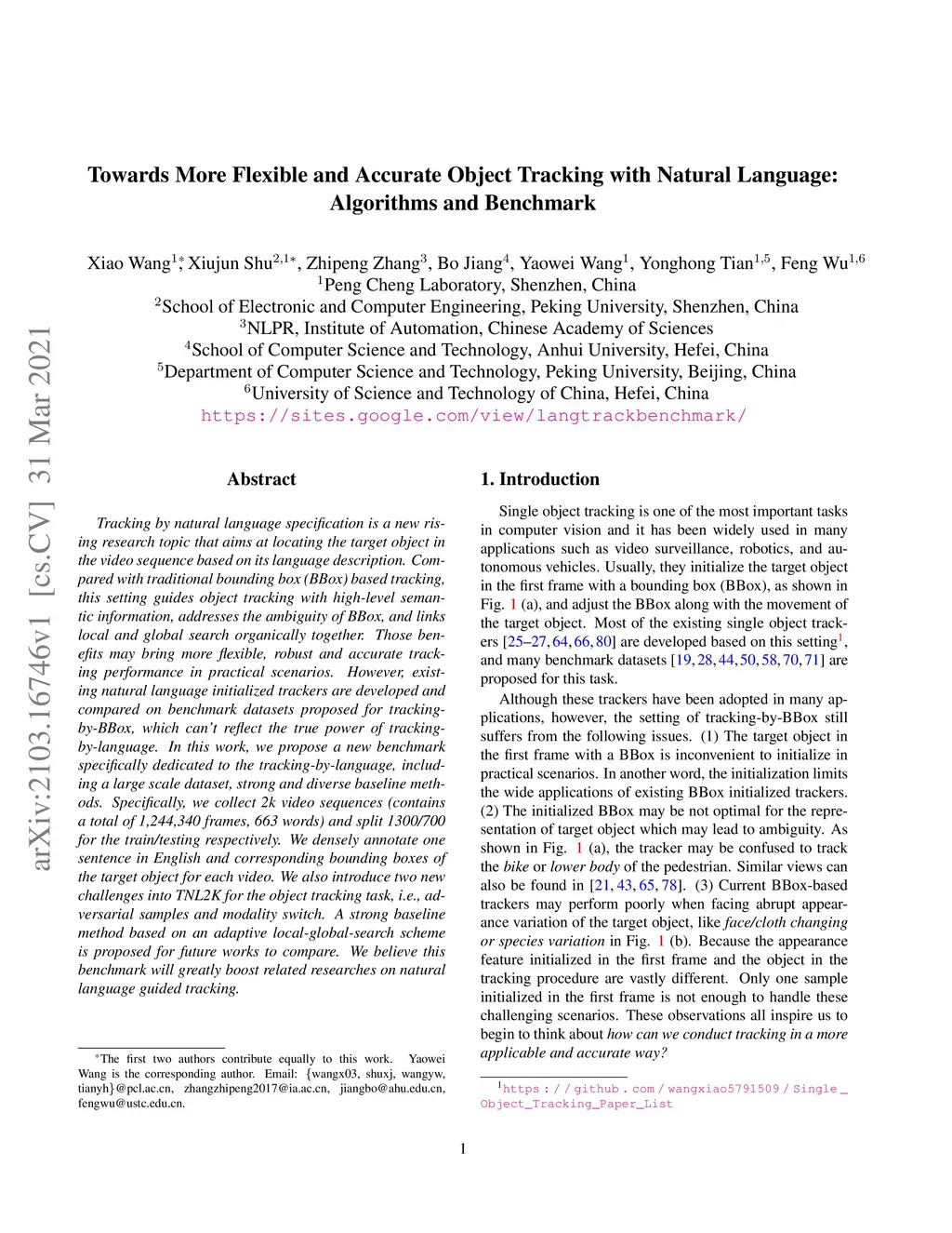 Tracking by natural language specification is a new rising research topic that aims at locating the target object in the video sequence based on its language description. Compared with traditional bounding box (BBox) based tracking, this setting guides object tracking with high-level semantic information, addresses the ambiguity of BBox, and links local and global search organically together. Those benefits may bring more flexible, robust and accurate tracking performance in practical scenarios. However, existing natural language initialized trackers are developed and compared on benchmark datasets proposed for tracking-by-BBox, which can't reflect the true power of tracking-by-language. In this work, we propose a new benchmark specifically dedicated to the tracking-by-language, including a large scale dataset, strong and diverse baseline methods. Specifically, we collect 2k video sequences (contains a total of 1,244,340 frames, 663 words) and split 1300/700 for the train/testing respectively. We densely annotate one sentence in English and corresponding bounding boxes of the target object for each video. We also introduce two new challenges into TNL2K for the object tracking task, i.e., adversarial samples and modality switch. A strong baseline method based on an adaptive local-global-search scheme is proposed for future works to compare. We believe this benchmark will greatly boost related researches on natural language guided tracking.