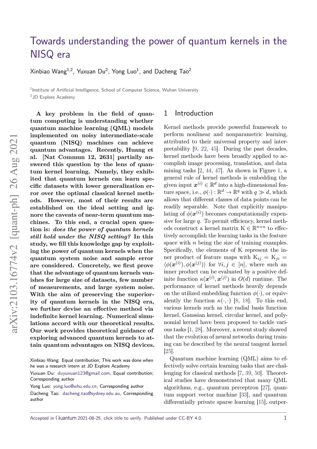 A key problem in the field of quantum computing is understanding whether quantum machine learning (QML) models implemented on noisy intermediate-scale quantum (NISQ) machines can achieve quantum advantages. Recently, Huang et al. [Nat Commun 12, 2631] partially answered this question by the lens of quantum kernel learning. Namely, they exhibited that quantum kernels can learn specific datasets with lower generalization error over the optimal classical kernel methods. However, most of their results are established on the ideal setting and ignore the caveats of near-term quantum machines. To this end, a crucial open question is: does the power of quantum kernels still hold under the NISQ setting? In this study, we fill this knowledge gap by exploiting the power of quantum kernels when the quantum system noise and sample error are considered. Concretely, we first prove that the advantage of quantum kernels is vanished for large size of datasets, few number of measurements, and large system noise. With the aim of preserving the superiority of quantum kernels in the NISQ era, we further devise an effective method via indefinite kernel learning. Numerical simulations accord with our theoretical results. Our work provides theoretical guidance of exploring advanced quantum kernels to attain quantum advantages on NISQ devices.