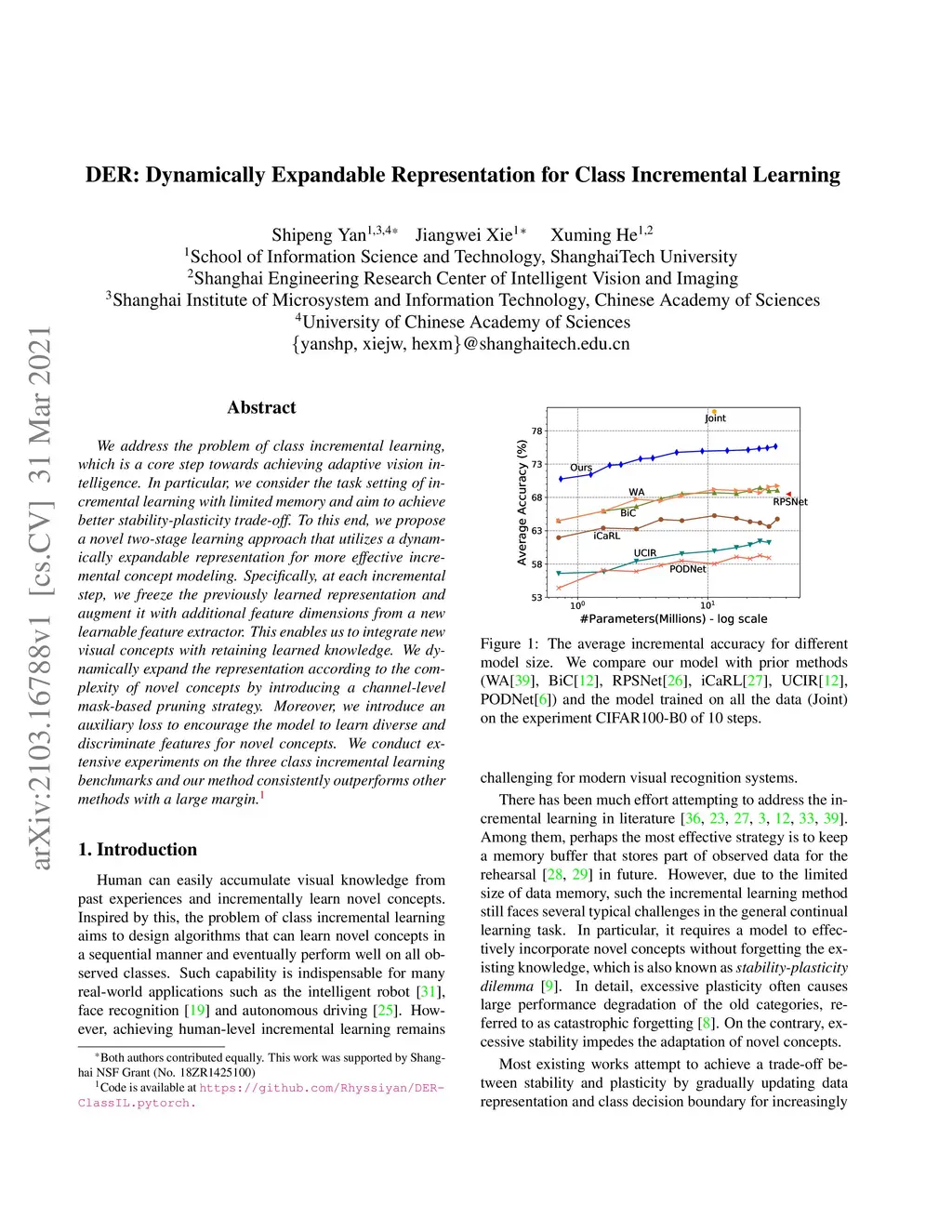We address the problem of class incremental learning, which is a core step towards achieving adaptive vision intelligence. In particular, we consider the task setting of incremental learning with limited memory and aim to achieve better stability-plasticity trade-off. To this end, we propose a novel two-stage learning approach that utilizes a dynamically expandable representation for more effective incremental concept modeling. Specifically, at each incremental step, we freeze the previously learned representation and augment it with additional feature dimensions from a new learnable feature extractor. This enables us to integrate new visual concepts with retaining learned knowledge. We dynamically expand the representation according to the complexity of novel concepts by introducing a channel-level mask-based pruning strategy. Moreover, we introduce an auxiliary loss to encourage the model to learn diverse and discriminate features for novel concepts. We conduct extensive experiments on the three class incremental learning benchmarks and our method consistently outperforms other methods with a large margin.