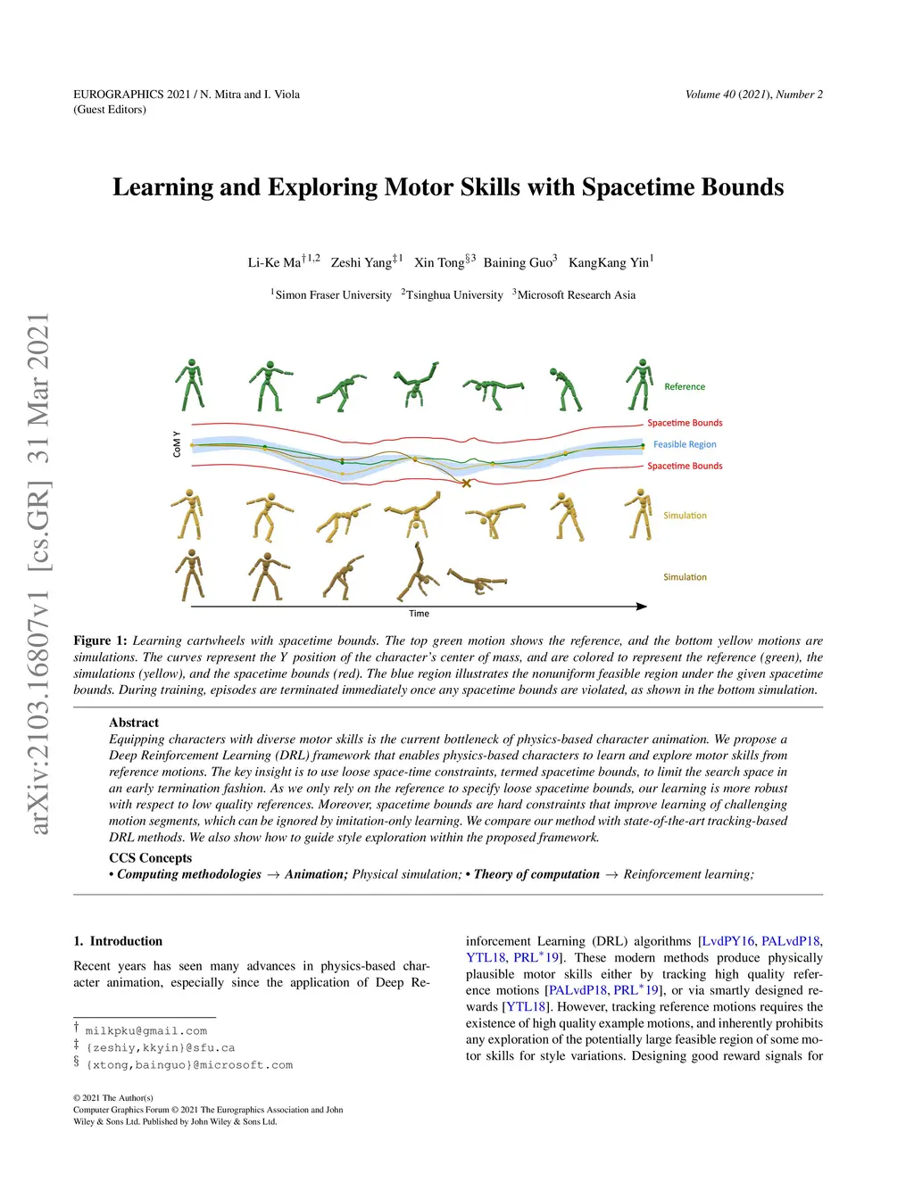 Equipping characters with diverse motor skills is the current bottleneck of physics-based character animation. We propose a Deep Reinforcement Learning (DRL) framework that enables physics-based characters to learn and explore motor skills from reference motions. The key insight is to use loose space-time constraints, termed spacetime bounds, to limit the search space in an early termination fashion. As we only rely on the reference to specify loose spacetime bounds, our learning is more robust with respect to low quality references. Moreover, spacetime bounds are hard constraints that improve learning of challenging motion segments, which can be ignored by imitation-only learning. We compare our method with state-of-the-art tracking-based DRL methods. We also show how to guide style exploration within the proposed framework