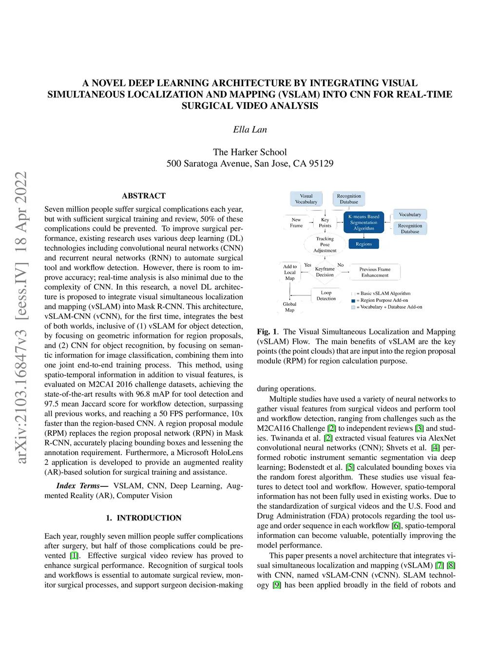 Seven million people suffer surgical complications each year, but with sufficient surgical training and review, 50\% of these complications could be prevented. To improve surgical performance, existing research uses various deep learning (DL) technologies including convolutional neural networks (CNN) and recurrent neural networks (RNN) to automate surgical tool and workflow detection. However, there is room to improve accuracy; real-time analysis is also minimal due to the complexity of CNN. In this research, a novel DL architecture is proposed to integrate visual simultaneous localization and mapping (vSLAM) into Mask R-CNN. This architecture, vSLAM-CNN (vCNN), for the first time, integrates the best of both worlds, inclusive of (1) vSLAM for object detection, by focusing on geometric information for region proposals, and (2) CNN for object recognition, by focusing on semantic information for image classification, combining them into one joint end-to-end training process. This method, using spatio-temporal information in addition to visual features, is evaluated on M2CAI 2016 challenge datasets, achieving the state-of-the-art results with 96.8 mAP for tool detection and 97.5 mean Jaccard score for workflow detection, surpassing all previous works, and reaching a 50 FPS performance, 10x faster than the region-based CNN. A region proposal module (RPM) replaces the region proposal network (RPN) in Mask R-CNN, accurately placing bounding boxes and lessening the annotation requirement. Furthermore, a Microsoft HoloLens 2 application is developed to provide an augmented reality (AR)-based solution for surgical training and assistance.