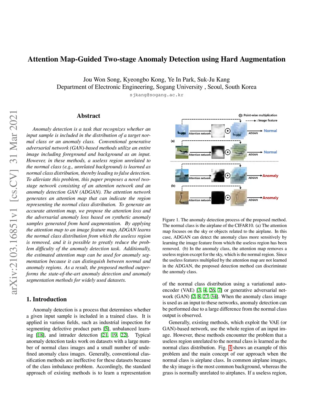 Anomaly detection is a task that recognizes whether an input sample is included in the distribution of a target normal class or an anomaly class. Conventional generative adversarial network (GAN)-based methods utilize an entire image including foreground and background as an input. However, in these methods, a useless region unrelated to the normal class (e.g., unrelated background) is learned as normal class distribution, thereby leading to false detection. To alleviate this problem, this paper proposes a novel two-stage network consisting of an attention network and an anomaly detection GAN (ADGAN). The attention network generates an attention map that can indicate the region representing the normal class distribution. To generate an accurate attention map, we propose the attention loss and the adversarial anomaly loss based on synthetic anomaly samples generated from hard augmentation. By applying the attention map to an image feature map, ADGAN learns the normal class distribution from which the useless region is removed, and it is possible to greatly reduce the problem difficulty of the anomaly detection task. Additionally, the estimated attention map can be used for anomaly segmentation because it can distinguish between normal and anomaly regions. As a result, the proposed method outperforms the state-of-the-art anomaly detection and anomaly segmentation methods for widely used datasets.