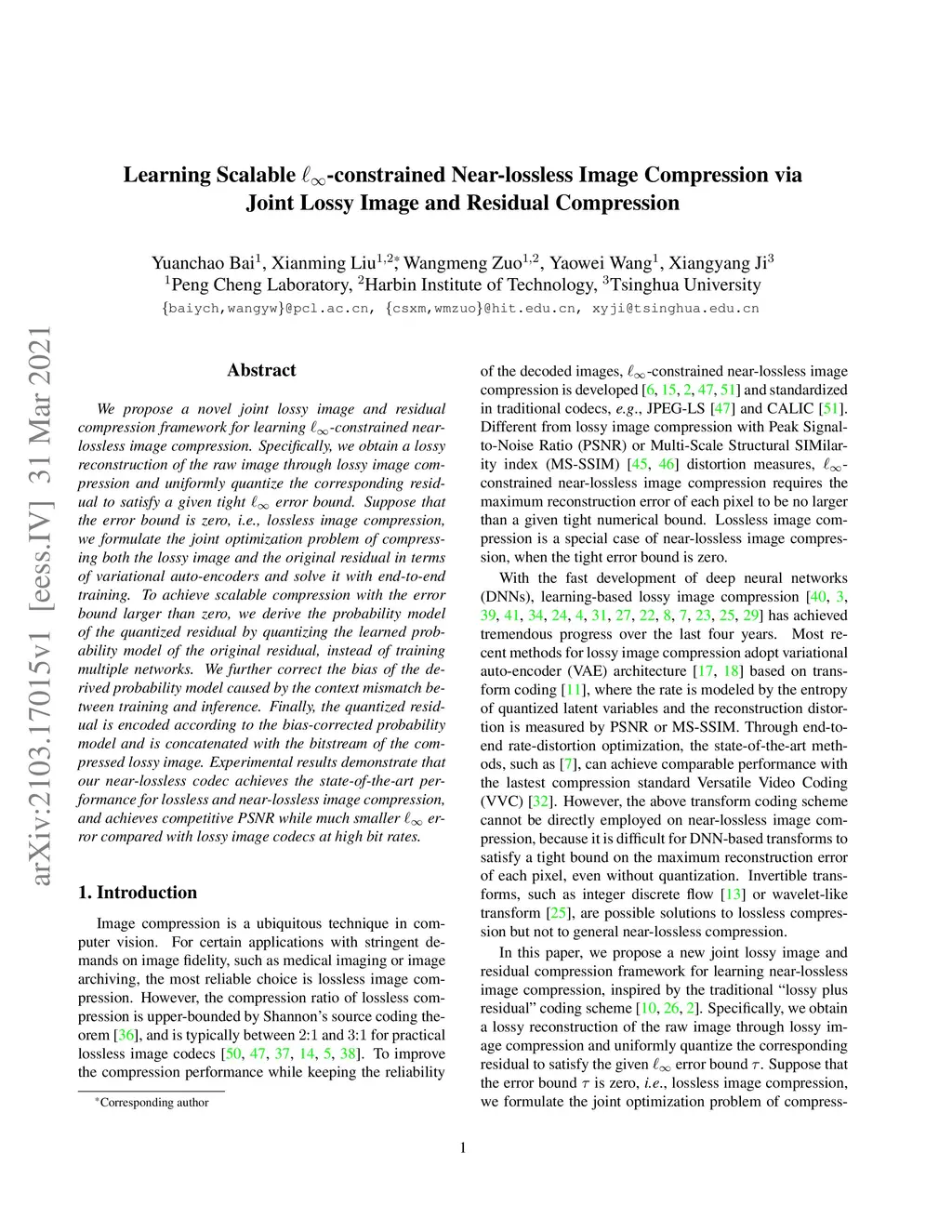 We propose a novel joint lossy image and residual compression framework for learning -constrained near-lossless image compression. Specifically, we obtain a lossy reconstruction of the raw image through lossy image compression and uniformly quantize the corresponding residual to satisfy a given tight error bound. Suppose that the error bound is zero, i.e., lossless image compression, we formulate the joint optimization problem of compressing both the lossy image and the original residual in terms of variational auto-encoders and solve it with end-to-end training. To achieve scalable compression with the error bound larger than zero, we derive the probability model of the quantized residual by quantizing the learned probability model of the original residual, instead of training multiple networks. We further correct the bias of the derived probability model caused by the context mismatch between training and inference. Finally, the quantized residual is encoded according to the bias-corrected probability model and is concatenated with the bitstream of the compressed lossy image. Experimental results demonstrate that our near-lossless codec achieves the state-of-the-art performance for lossless and near-lossless image compression, and achieves competitive PSNR while much smaller error compared with lossy image codecs at high bit rates.