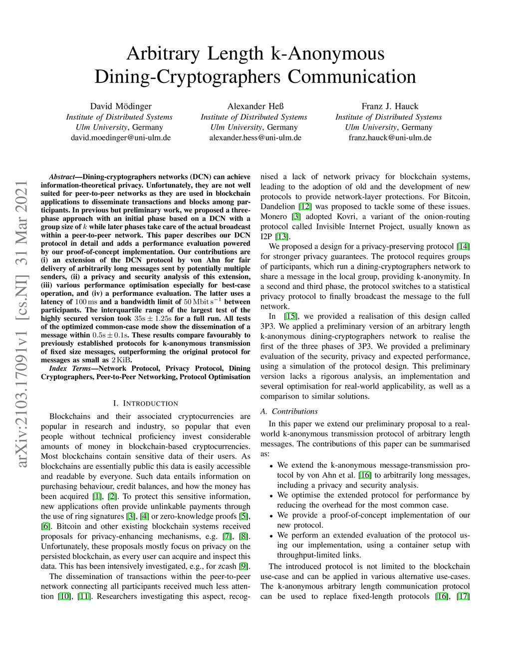 Dining-cryptographers networks (DCN) can achieve information-theoretical privacy. Unfortunately, they are not well suited for peer-to-peer networks as they are used in blockchain applications to disseminate transactions and blocks among participants. In previous but preliminary work, we proposed a threephase approach with an initial phase based on a DCN with a group size of k while later phases take care of the actual broadcast within a peer-to-peer network. This paper describes our DCN protocol in detail and adds a performance evaluation powered by our proof-of-concept implementation. Our contributions are (i) an extension of the DCN protocol by von Ahn for fair delivery of arbitrarily long messages sent by potentially multiple senders, (ii) a privacy and security analysis of this extension, (iii) various performance optimisation especially for best-case operation, and (iv) a performance evaluation. The latter uses a latency of 100 ms and a bandwidth limit of 50 Mbit/s between participants. The interquartile range of the largest test of the highly secured version took 35s+-1.25s for a full run. All tests of the optimized common-case mode show the dissemination of a message within 0.5s+-0.1s. These results compare favourably to previously established protocols for k-anonymous transmission of fixed size messages, outperforming the original protocol for messages as small as 2 KiB.