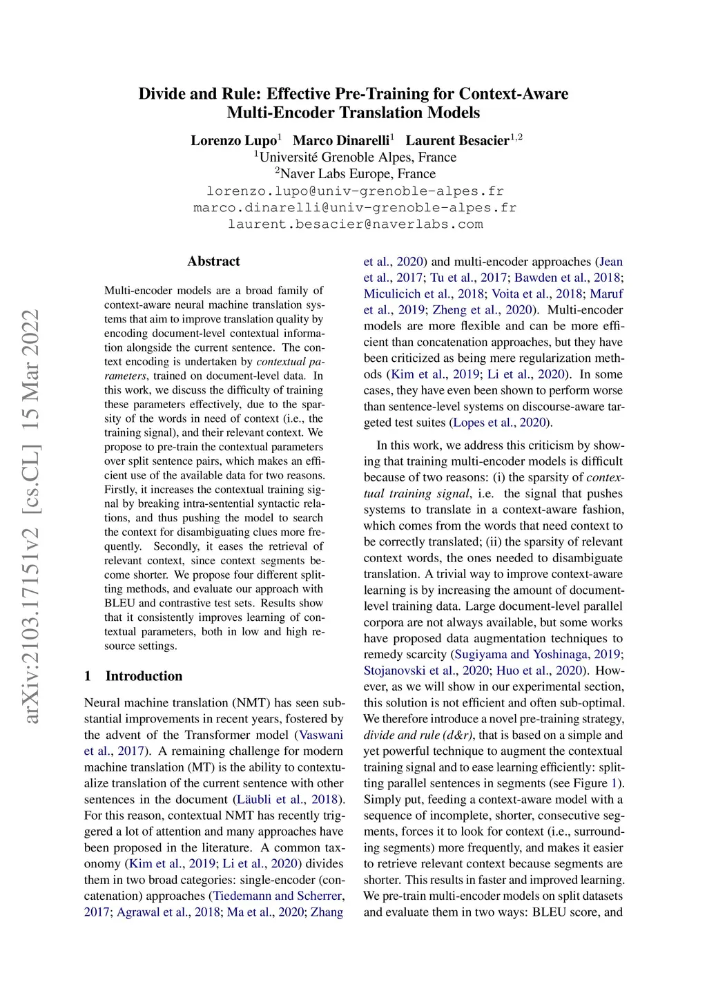Multi-encoder models are a broad family of context-aware neural machine translation systems that aim to improve translation quality by encoding document-level contextual information alongside the current sentence. The context encoding is undertaken by contextual parameters, trained on document-level data. In this work, we discuss the difficulty of training these parameters effectively, due to the sparsity of the words in need of context (i.e., the training signal), and their relevant context. We propose to pre-train the contextual parameters over split sentence pairs, which makes an efficient use of the available data for two reasons. Firstly, it increases the contextual training signal by breaking intra-sentential syntactic relations, and thus pushing the model to search the context for disambiguating clues more frequently. Secondly, it eases the retrieval of relevant context, since context segments become shorter. We propose four different splitting methods, and evaluate our approach with BLEU and contrastive test sets. Results show that it consistently improves learning of contextual parameters, both in low and high resource settings.