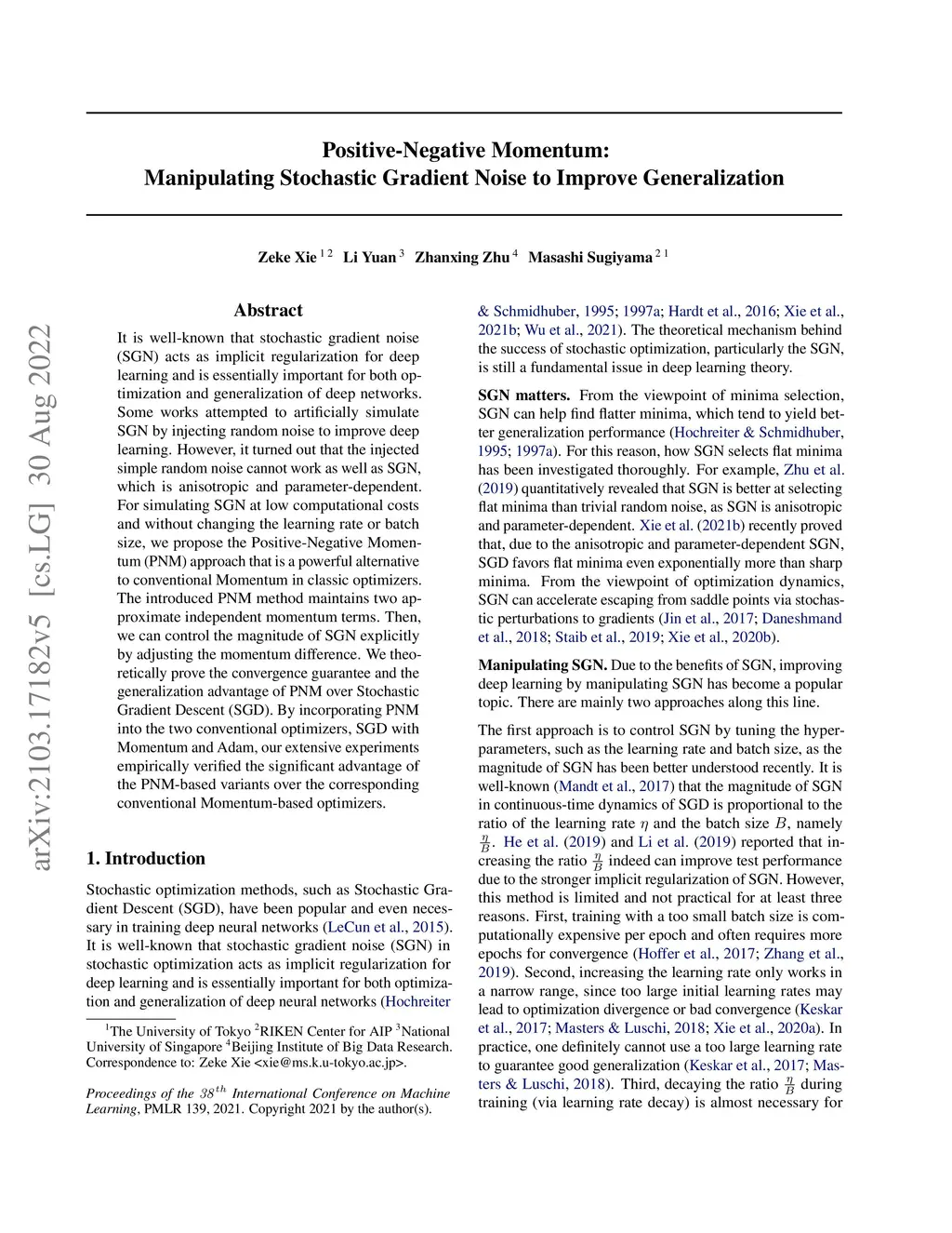 It is well-known that stochastic gradient noise (SGN) acts as implicit regularization for deep learning and is essentially important for both optimization and generalization of deep networks. Some works attempted to artificially simulate SGN by injecting random noise to improve deep learning. However, it turned out that the injected simple random noise cannot work as well as SGN, which is anisotropic and parameter-dependent. For simulating SGN at low computational costs and without changing the learning rate or batch size, we propose the Positive-Negative Momentum (PNM) approach that is a powerful alternative to conventional Momentum in classic optimizers. The introduced PNM method maintains two approximate independent momentum terms. Then, we can control the magnitude of SGN explicitly by adjusting the momentum difference. We theoretically prove the convergence guarantee and the generalization advantage of PNM over Stochastic Gradient Descent (SGD). By incorporating PNM into the two conventional optimizers, SGD with Momentum and Adam, our extensive experiments empirically verified the significant advantage of the PNM-based variants over the corresponding conventional Momentum-based optimizers.