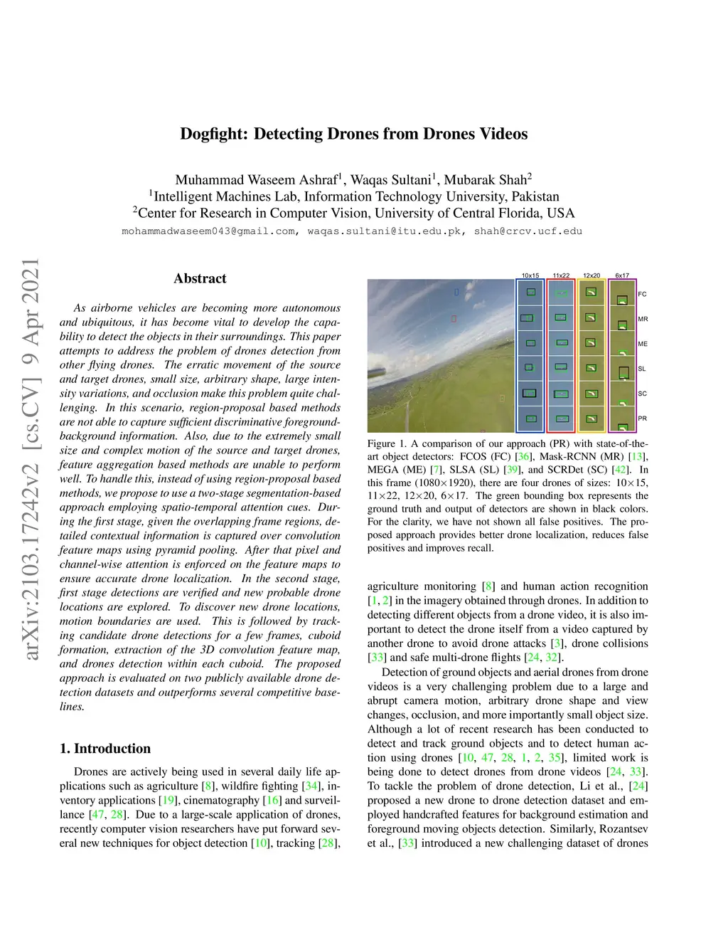 As airborne vehicles are becoming more autonomous and ubiquitous, it has become vital to develop the capability to detect the objects in their surroundings. This paper attempts to address the problem of drones detection from other flying drones. The erratic movement of the source and target drones, small size, arbitrary shape, large intensity variations, and occlusion make this problem quite challenging. In this scenario, region-proposal based methods are not able to capture sufficient discriminative foreground-background information. Also, due to the extremely small size and complex motion of the source and target drones, feature aggregation based methods are unable to perform well. To handle this, instead of using region-proposal based methods, we propose to use a two-stage segmentation-based approach employing spatio-temporal attention cues. During the first stage, given the overlapping frame regions, detailed contextual information is captured over convolution feature maps using pyramid pooling. After that pixel and channel-wise attention is enforced on the feature maps to ensure accurate drone localization. In the second stage, first stage detections are verified and new probable drone locations are explored. To discover new drone locations, motion boundaries are used. This is followed by tracking candidate drone detections for a few frames, cuboid formation, extraction of the 3D convolution feature map, and drones detection within each cuboid. The proposed approach is evaluated on two publicly available drone detection datasets and outperforms several competitive baselines.